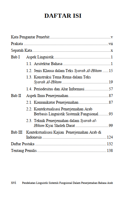 Buku referensi ini merupakan sebuah usaha untuk mengelaborasi kajian terjemahan Arab di Indonesia dengan menggunakan pendekatan dari berbagai macam sisi, salah satunya adalah Lingustik Sistemik Fungsional (LSF) dan ilmu Penerjemahan. Selama ini, masih sangat sedikit para akademisi yang menggunakan LSF sebagai salah satu pendekatan dalam mengkaji Bahasa Arab. Apalagi kajian yang secara khusus menggabungkan antara LSF dan ilmu penerjemahan, akhir-akhir ini sudah mulai banyak dikaji, misalnya Systemic Functional Translation Studies (SFTS) yang dikembangkan oleh (Bo Wang & Yuanyi Ma, 2021). Diharapkan buku ini menjadi salah satu buku yang mengulas tentang penerjemahan Arab berbasis Linguistik Sistemik Fungsional dengan konteks keindonesiaan.