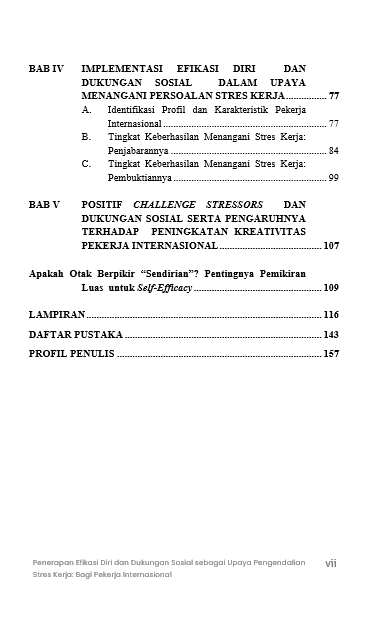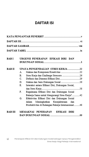 Berikut Daftar Isi Buku Manajemen berjudul Buku Penerapan Efikasi Diri dan Dukungan Sosial sebagai Upaya Pengendalian Stres Kerja: Bagi Pekerja Internasional, diantaranya: