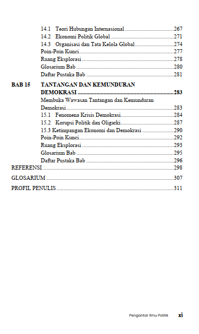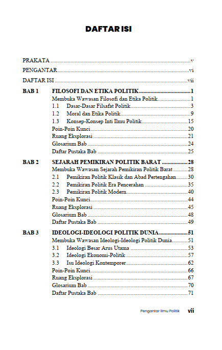 Buku Pengantar Ilmu Politik hadir sebagai sumber wawasan terkini bagi pembaca yang ingin memahami dasar-dasar ilmu politik secara sistematis dan mudah dipahami. Disusun dengan uraian yang lugas dan aplikatif, buku ini mengupas berbagai konsep penting seperti kekuasaan, negara, pemerintahan, demokrasi, ideologi politik, hingga dinamika hubungan antara masyarakat dan lembaga politik. Tidak hanya membahas teori klasik, buku ini juga mengaitkan perkembangan ilmu politik dengan realitas kontemporer, sehingga pembaca dapat melihat relevansi konsep-konsep tersebut dalam kehidupan sehari-hari. Setiap bab disusun secara terstruktur, dilengkapi dengan contoh kasus yang kontekstual untuk membantu memperdalam pemahaman.