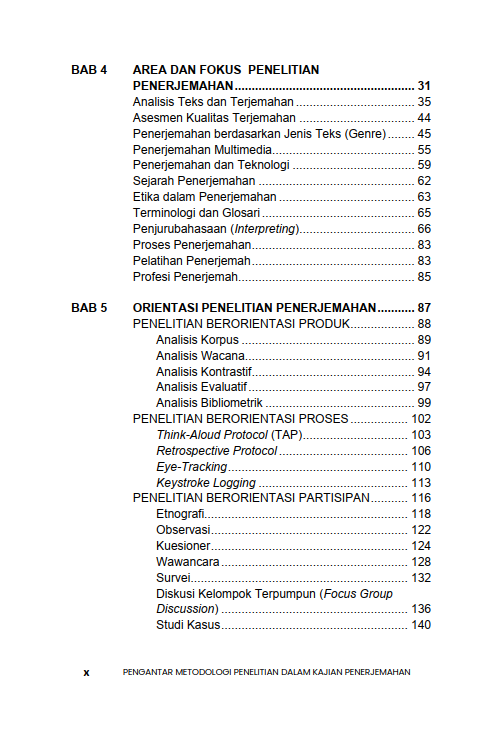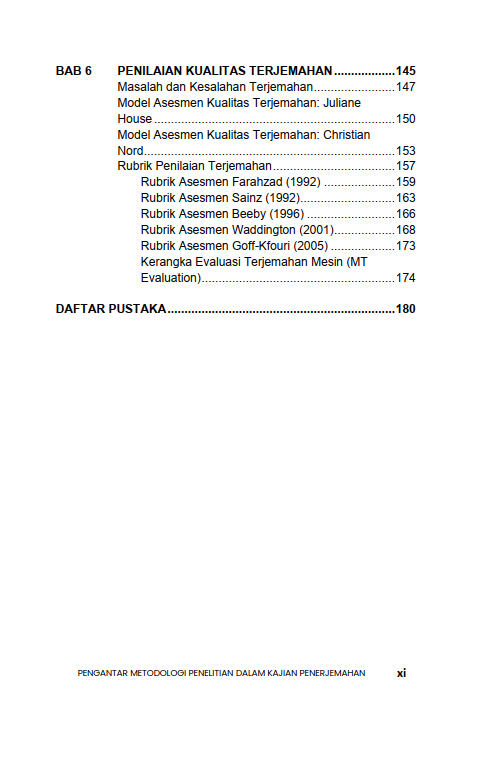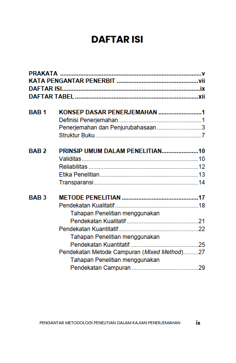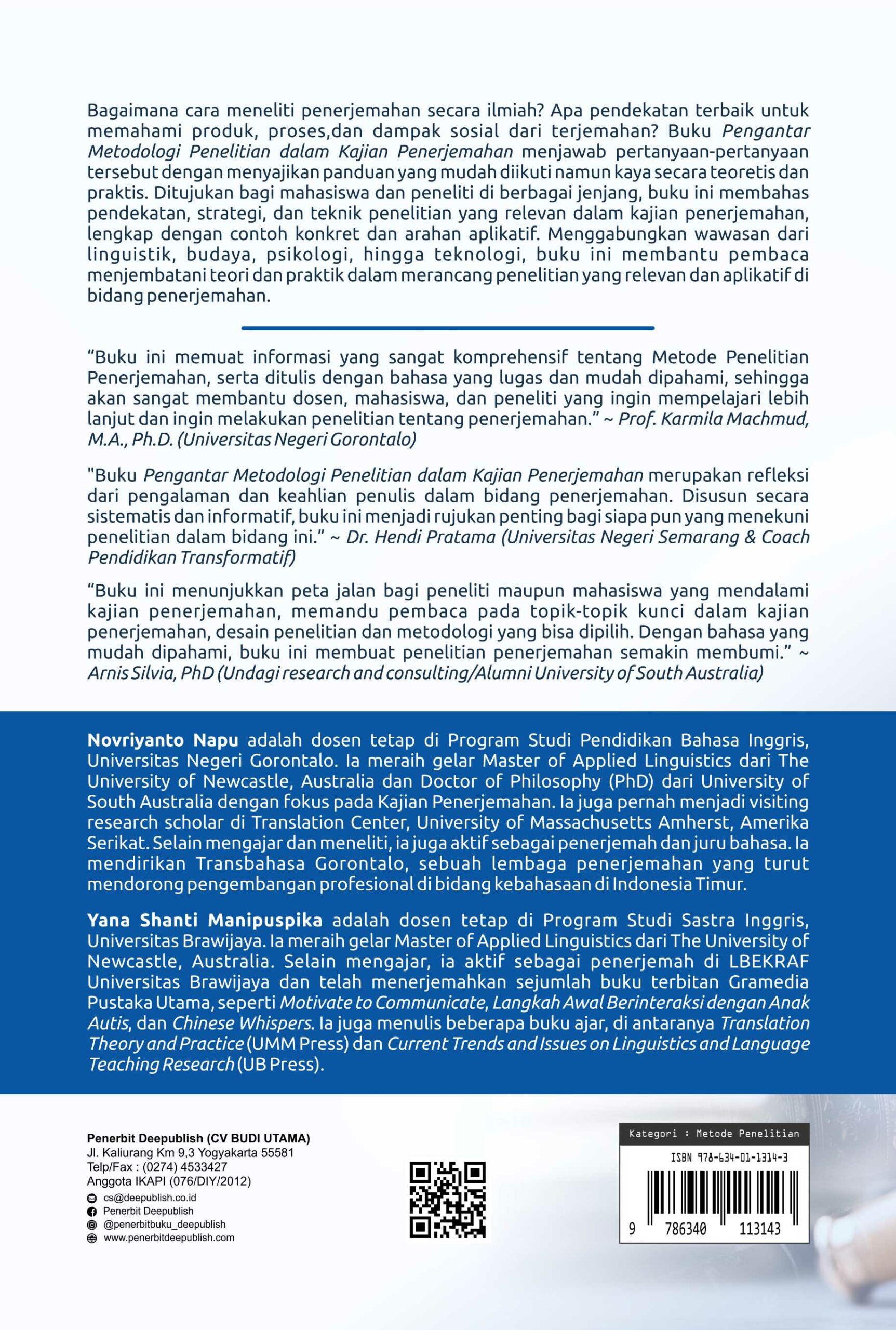 Sinopsis Buku Pengantar Metodologi Penelitian dalam Kajian Penerjemahan Buku Pengantar Metodologi Penelitian dalam Kajian Penerjemahan Buku Metodologi Penelitian yang berjudul Buku Pengantar Metodologi Penelitian dalam Kajian Penerjemahan merupakan karya Novriyanto Napu dan Yana Shanti Manipuspika. Sebagai bidang yang dinamis dan terus berevolusi, kajian penerjemahan membutuhkan landasan metodologis yang kuat, agar penelitian-penelitian di dalamnya dapat dilakukan secara sistematis, sahih, dan berdampak. Metodologi yang tepat memungkinkan peneliti mengidentifikasi pertanyaan yang relevan, memilih pendekatan yang sesuai, dan merancang penelitian yang mampu menjawab berbagai persoalan dalam dunia penerjemahan, baik dalam ranah akademik maupun profesional. Metodologi penelitian penerjemahan telah berkembang menjadi bagian penting dalam kajian lintas disiplin, mencakup pendekatan, strategi, dan teknik untuk meneliti penerjemahan sebagai produk, proses, dan praktik sosial. Kajian ini menggabungkan wawasan dari berbagai bidang seperti linguistik, sastra, budaya, psikologi, dan teknologi, guna memahami proses alih makna antarbahasa serta dampak sosialnya. Karena sifatnya yang dinamis, penelitian dalam bidang ini memerlukan metodologi yang kuat agar sistematis dan relevan. Metodologi yang tepat membantu peneliti merumuskan pertanyaan yang jelas, memilih pendekatan yang sesuai, dan merancang penelitian yang berdampak baik secara akademik maupun profesional. Buku ini disusun untuk membimbing mahasiswa dan peneliti pemula dalam memahami dan menerapkan metodologi penelitian penerjemahan. Pembaca akan dibekali pemahaman mendalam mengenai metode penelitian kualitatif, kuantitatif, dan campuran. Buku ini juga memetakan berbagai area dan orientasi penelitian yang luas, mulai dari teknologi dan sejarah, hingga analisis produk dan proses penerjemahan menggunakan teknik seperti analisis korpus. Disajikan dengan bahasa yang mudah diikuti, buku ini memadukan teori dan praktik melalui contoh-contoh konkret dalam menyusun penelitian. Buku Pengantar Metodologi Penelitian dalam Kajian Penerjemahan dapat menjadi pijakan awal yang kokoh bagi para peneliti muda, praktisi, dan akademisi yang ingin berkontribusi dalam pengembangan ilmu pengetahuan di bidang penerjemahan. Berikut Daftar Isi Buku Metodologi Penelitian yang berjudul Buku Pengantar Metodologi Penelitian dalam Kajian Penerjemahan, diantaranya: