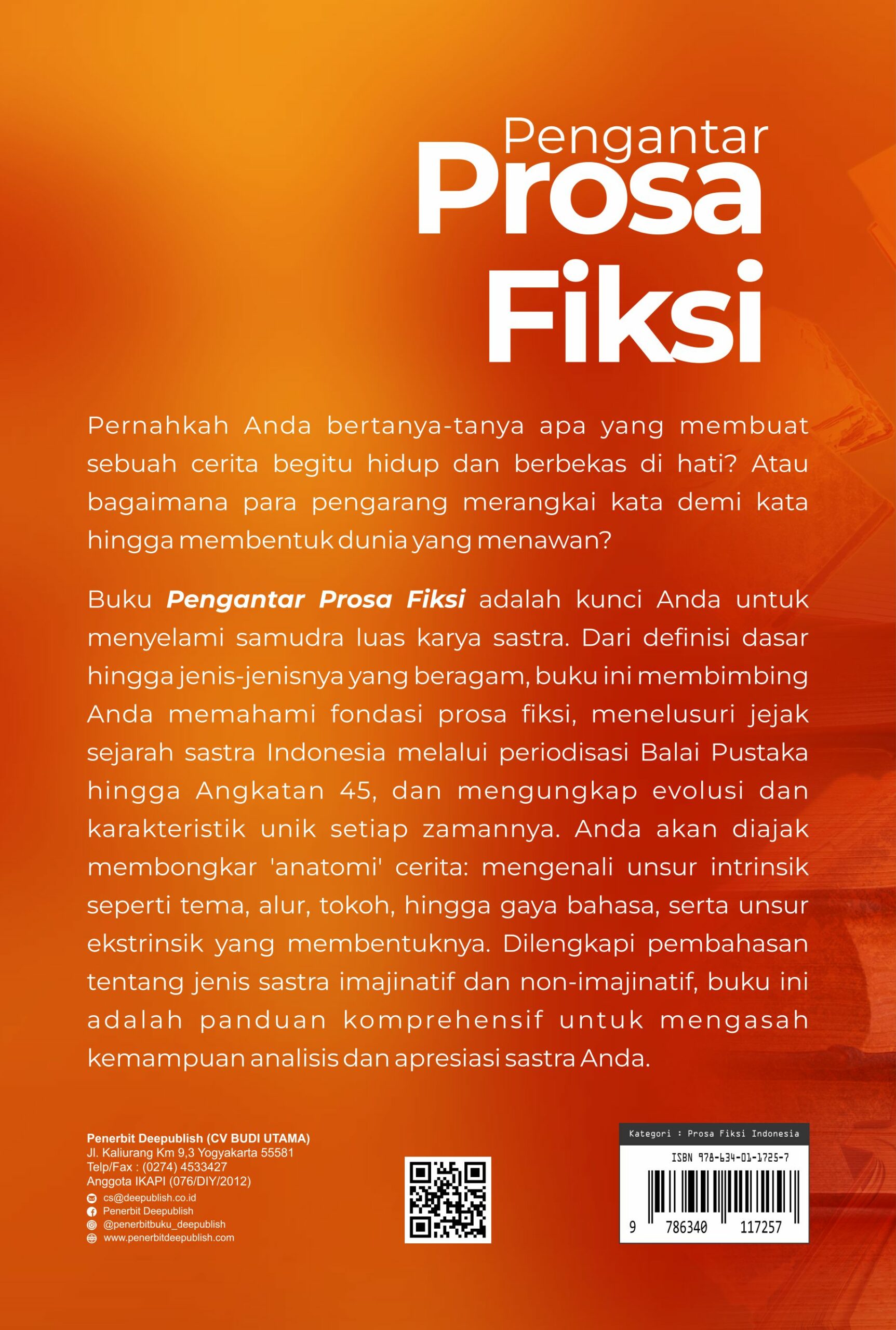 Buku Pengantar Prosa Fiksi diterbitkan oleh Penerbit Buku Pendidikan Deepublish.