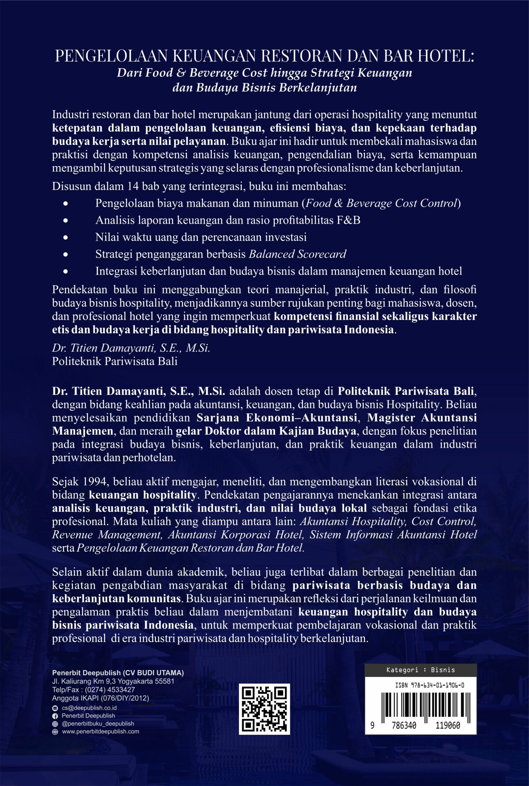 Buku Pengelolaan Keuangan Restoran dan Bar Hotel: Dari Food & Beverage Cost Hingga Strategi Keuangan dan Budaya Bisnis Berkelanjutan diterbitkan oleh Penerbit Buku Pendidikan Deepublish.