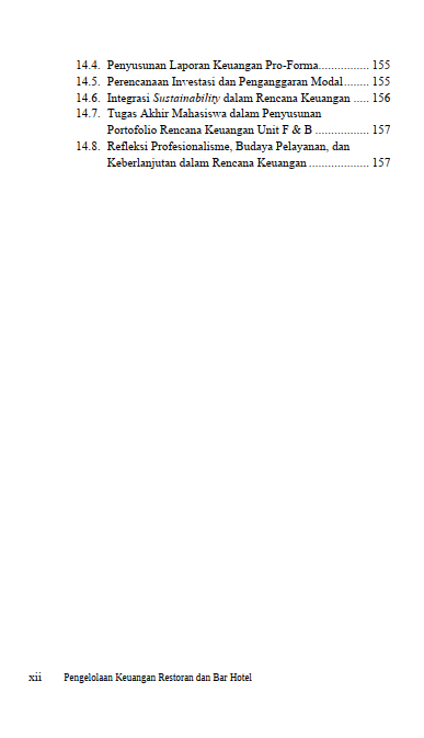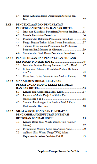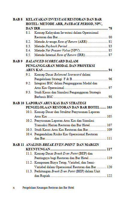 Dengan cara aplikatif dan berbasis praktik nyata, buku ini menghadirkan referensi lengkap tentang food & beverage cost control, uraian laporan keuangan, manajemen persediaan dan piutang, nilai waktu uang, kelayakan investasi (ARR, PP, NPV, IRR), hingga strategi penganggaran berbasis Balanced Scorecard dan keuangan berkelanjutan.