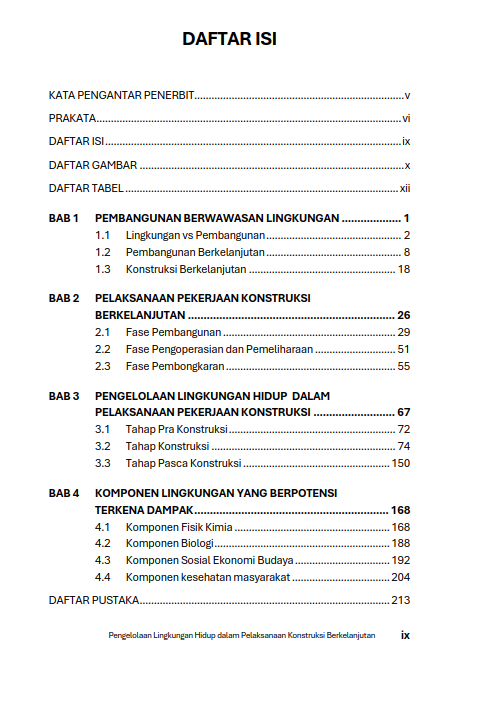Berikut Daftar Isi Buku Teknik yang berjudul Buku Pengelolaan Lingkungan Hidup dalam Pelaksanaan Konstruksi Berkelanjutan, diantaranya: