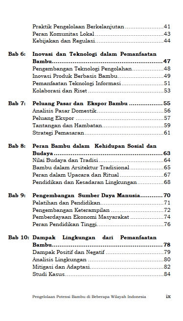 Di era meningkatnya kesadaran global akan pentingnya keberlanjutan, bambu menawarkan solusi alami yang ramah lingkungan sebagai alternatif plastik dan material bangunan modern. Namun, pemanfaatannya di tingkat lokal masih terkendala oleh minimnya inovasi, terbatasnya akses pasar, dan kurangnya dukungan teknologi. Oleh karena itu, buku ini hadir sebagai referensi yang komprehensif bagi pemerintah, lembaga kehutanan, pelaku usaha, dan masyarakat. Pendekatan yang ditawarkan tidak hanya teknis, tetapi juga menekankan pemberdayaan masyarakat untuk mencapai keseimbangan antara pelestarian alam dan peningkatan ekonomi lokal. Buku Pengelolaan Potensi Bambu di Beberapa Wilayah Indonesia sangat cocok menjadi referensi yang dapat dimanfaatkan oleh berbagai pihak, termasuk pemerintah daerah, lembaga pengelola hutan, pelaku usaha, akademisi, dan masyarakat sebagai acuan dalam mengembangkan potensi bambu secara terpadu dan berkelanjutan.