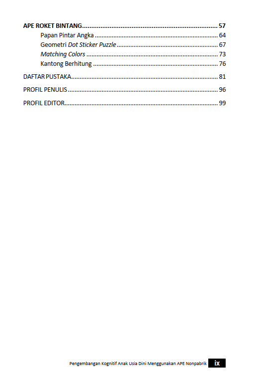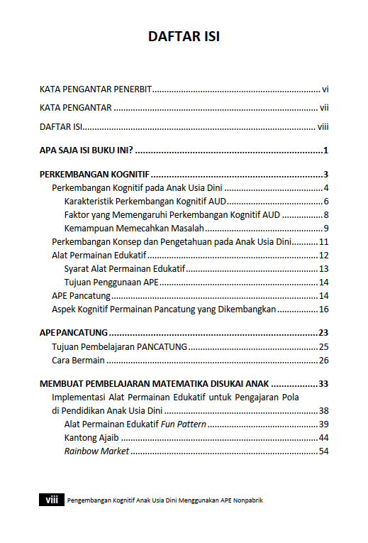 Berikut Daftar Isi Buku Pendidikan berjudul Buku Pengembangan Kognitif Anak Usia Dini Menggunakan APE Nonpabrik, diantaranya:
