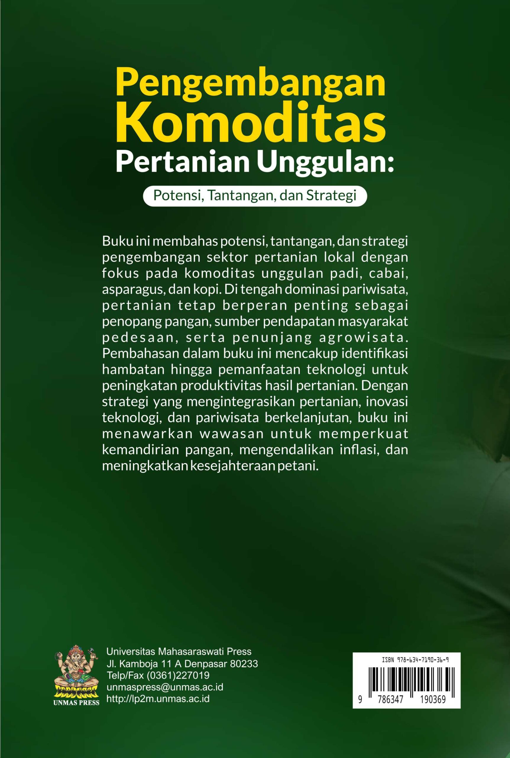 Buku ini membahas potensi, tantangan, dan strategi pengembangan sektor pertanian lokal dengan fokus pada komoditas unggulan padi, cabai, asparagus, dan kopi. Di tengah dominasi pariwisata, pertanian tetap berperan penting sebagai penopang pangan, sumber pendapatan masyarakat pedesaan, serta penunjang agrowisata. Buku Pengembangan Komoditas Pertanian Unggulan: Potensi, Tantangan, dan Strategi sangat cocok bagi para peneliti, mahasiswa, dan praktisi di bidang pertanian, pariwisata dan agrowisata juga bagi petani dan masyarakat secara umum yang ingin mendalami identifikasi hambatan hingga pemanfaatan teknologi untuk peningkatan produktivitas hasil pertanian.