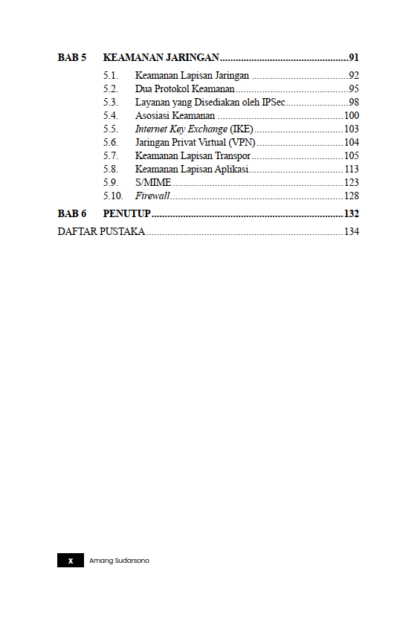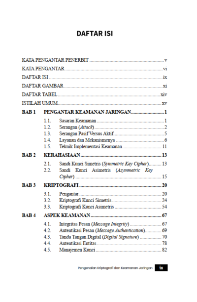 Sinopsis Buku Pengenalan Kriptografi dan Keamanan Jaringan Buku Pengenalan Kriptografi dan Keamanan Jaringan Buku Ilmu Komputer yang berjudul Buku Pengenalan Kriptografi dan Keamanan Jaringan merupakan karya Amang Sudarsono. Internet telah menjadi jaringan komunikasi global yang mengubah banyak aspek kehidupan kita. Perdagangan daring memungkinkan orang berbelanja tanpa harus mengunjungi toko fisik, sementara World Wide Web (WWW) membuka akses luas untuk berbagi informasi. Teknologi email juga memfasilitasi komunikasi antarindividu di berbagai penjuru dunia. Namun, perkembangan pesat ini membawa konsekuensi berupa meningkatnya ketergantungan pada Internet dan munculnya tantangan terkait keamanan. Sebagai forum terbuka, Internet menghadirkan risiko yang memerlukan perhatian serius, terutama dalam menjaga kerahasiaan, integritas data, dan autentikasi komunikasi. Dalam era digital ini, keamanan jaringan menjadi sangat penting untuk memastikan komunikasi daring tetap aman dan terlindungi. Konsumen perlu memastikan bahwa transaksi mereka dengan vendor daring terjamin, dan komunikasi dengan bank tidak mengalami gangguan atau manipulasi. Keamanan jaringan mencakup serangkaian protokol yang dirancang agar pengguna dapat beraktivitas dengan nyaman tanpa ancaman serangan siber. Salah satu metode yang paling umum dan efektif dalam menjaga keamanan ini adalah kriptografi, sebuah teknik kuno yang kini dikembangkan untuk kebutuhan modern. Buku ini mengulas prinsip-prinsip dasar kriptografi dan mengaplikasikannya untuk menjelaskan protokol keamanan jaringan secara rinci. Berikut Daftar Isi Buku Ilmu Komputer yang berjudul Buku Pengenalan Kriptografi dan Keamanan Jaringan, diantaranya: