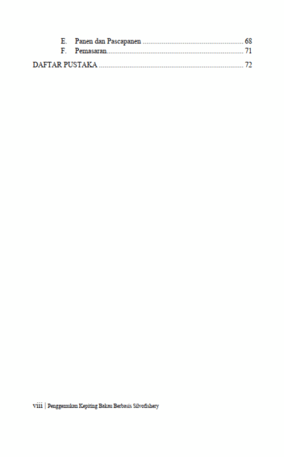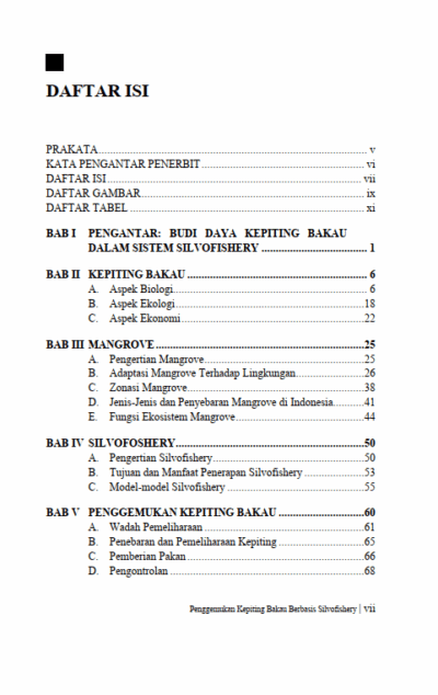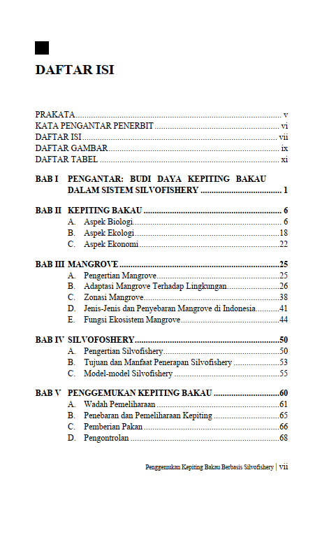 Berikut Daftar Isi Buku Peternakan yang berjudul Buku Penggemukan Kepiting Bakau Berbasis Silvofishery, diantaranya: