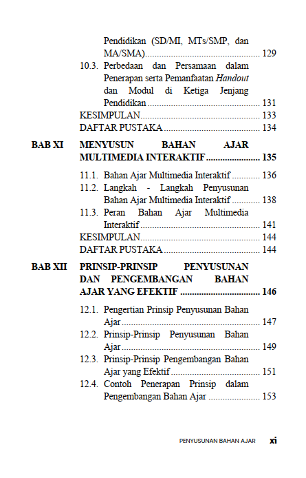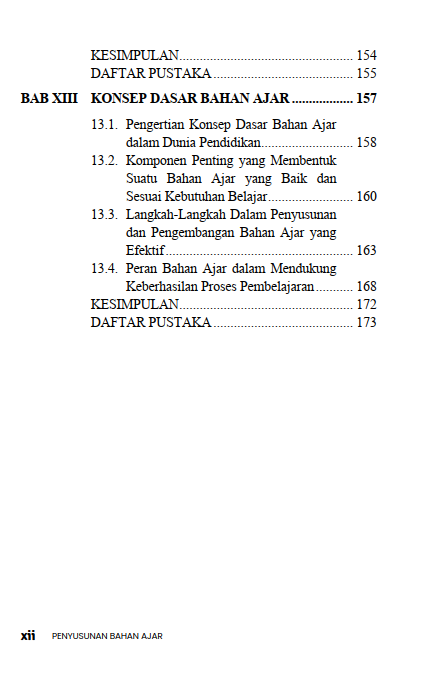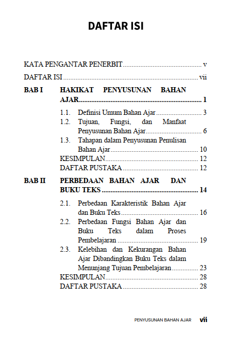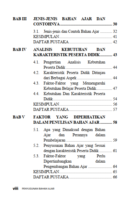 Buku berjudul “Penyusunan Bahan Ajar” ini merupakan buku acuan dan buku ajar yang membahas secara komprehensif mengenai prinsip-prinsip, Langkah-langkah, dan metode dalam mengembangkan materi pembelajaran yang efektif. Adapun jumlah bab dalam buku ini sebanyak 13 bab, poin-poin utama dalam buku ini sebagai berikut: Konsep Dasar Bahan Ajar: Menjelaskan mengenai definisi bahan ajar, fungsi, peran dalam proses pembelajaran, serta berbagai jenis bahan ajar (cetak dan non-cetak). Prinsip-prinsip Pengembangan: Membahas mengenai prinsip-prinsip kunci seperti relevansi (kesesuaian dengan tujuan dan kebutuhan), konsistensi, dan kecukupan materi. Langkah-langkah Praktis: Menguraikan panduan sistematis tentang tahapan penyusunan, mulai dari kebutuhan peserta didik dan kurikulum, perumusan tujuan pembelajaran, penentuan jenis bahan ajar, hingga penulisan dan evaluasi materi. Komponen Bahan Ajar: Menguraikan tentang struktur atau komponen yang harus ada dalam bahan ajar yang baik, seperti petunjuk belajar, isi materi, latihan soal, dan informasi pendukung. Strategi Penulisan: Menguraikan secara bertahap tips dan strategi praktis bagi pendidik atau penulis dalam menyusun bahan ajar, termasuk cara mengemas kembali informasi atau menulis bahan ajar dari awal (starting from scratch). Secara keseluruhan, buku ini berfungsi sebagai acuan metodologis bagi para pendidik, dosen, atau pengembang kurikulum untuk menciptakan bahan ajar berkualitas yang dapat mempermudah proses belajar mengajar dan membantu peserta didik mencapai kompetensi yang diharapkan.