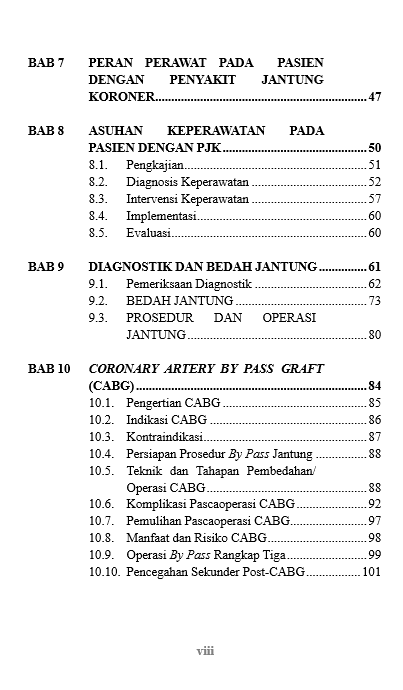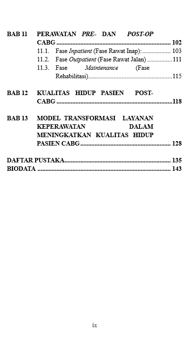 Sinopsis Buku Perawatan Pasca Operasi Jantung: Model Transformasi Digital Layanan Keperawatan dalam Upaya Peningkatan Kualitas Hidup Pasien CABG Buku Perawatan Pasca Operasi Jantung: Model Transformasi Digital Layanan Keperawatan dalam Upaya Peningkatan Kualitas Hidup Pasien CABG Buku Keperawatan berjudul Buku Perawatan Pasca Operasi Jantung: Model Transformasi Digital Layanan Keperawatan dalam Upaya Peningkatan Kualitas Hidup Pasien CABG merupakan karya Syafrisar Meri Agritubella, Rian Yuliyana, Masnun dan Ardenny. Operasi bypass jantung (CABG) adalah prosedur medis yang sering dilakukan untuk mengatasi penyakit jantung koroner yang parah. Prosedur ini melibatkan pembuatan jalur alternatif aliran darah ke jantung untuk melewati bagian arteri yang tersumbat. Meskipun CABG terbukti efektif dalam meningkatkan kualitas hidup pasien, prosedur ini juga memiliki risiko komplikasi. Beberapa komplikasi yang mungkin terjadi setelah operasi CABG antara lain gangguan pada jantung, paru-paru, ginjal, dan sistem saraf. Selain itu, risiko infeksi luka operasi juga perlu diwaspadai. Meskipun tingkat kematian setelah operasi CABG telah menurun dalam beberapa tahun terakhir, risiko komplikasi tetap ada dan perlu dipertimbangkan sebelum menjalani prosedur ini. Oleh karena itu, penting bagi pasien untuk berkonsultasi dengan dokter spesialis jantung untuk mengetahui risiko dan manfaat dari prosedur CABG. Perawatan pascaoperasi CABG bertujuan mengurangi risiko komplikasi dan meningkatkan kualitas hidup pasien melalui rehabilitasi. Rehabilitasi membantu memulihkan kondisi fisik, mental, dan sosial pasien, serta meningkatkan kapasitas fungsional dan aktivitas sehari-hari. Penelitian menunjukkan bahwa kualitas hidup pasien pasca-CABG meningkat secara signifikan dibandingkan sebelum operasi. Perawat memainkan peran penting dalam memberikan pendampingan, edukasi, dan layanan berkelanjutan, baik selama perawatan di rumah sakit maupun di rumah. Inovasi digital dalam pelayanan keperawatan diperlukan untuk memberikan pengetahuan komprehensif kepada pasien tentang perawatan sebelum dan setelah operasi, sehingga mempercepat pemulihan dan meningkatkan efikasi diri pasien. Berikut Daftar Isi Buku Keperawatan berjudul Buku Perawatan Pasca Operasi Jantung: Model Transformasi Digital Layanan Keperawatan dalam Upaya Peningkatan Kualitas Hidup Pasien CABG, diantaranya: