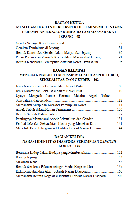 Buku ini berlandaskan dari dua novel karya Lee Yangji, Koku dan Yuhi, mengupas tuntas narasi feminis yang digunakan untuk mengungkap identitas diaspora perempuan Zainichi Korea generasi kedua yang digali melalui aspek tubuh, seksualitas, dan gender sebagai konstruksi sosial. Penjelasan tentang narasi baik tentang feminisme dan diaspora yang disampaikan di dalam buku ini memberikan gambaran utuh bagaimana perjuangan perempuan Zainichi Korea untuk menemukan kembali akar yang sempat tercerabut dari diri mereka. Melalui perspektif feminis, buku ini berhasil menyoroti dinamika agensi dan resistensi, para tokoh perempuan karya sastra tersebut dalam menghadapi kegamangan identitasnya. Proses penyelesaian kegamangan tersebut juga menjadi proses pemberdayaan diri mereka. Sebagai contoh, keputusan tokoh utama perempuan novel Koku mengunjungi tanah leluhurnya untuk menyelesaikan dampak ketercerabutan akar budayanya. Buku Perempuan Zainichi Korea Narasi Feminis dan Diaspora dalam Novel Karya Lee Yanji sangat cocok tidak hanya bagi pemerhati sastra Jepang, diaspora, namun juga bagi pemerhati yang tertarik pada isu relasi gender, pemberdayaan perempuan dan feminisme.