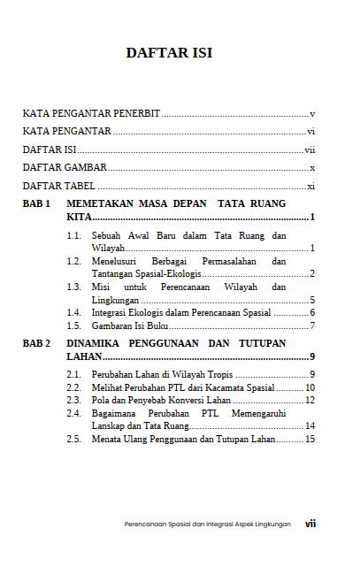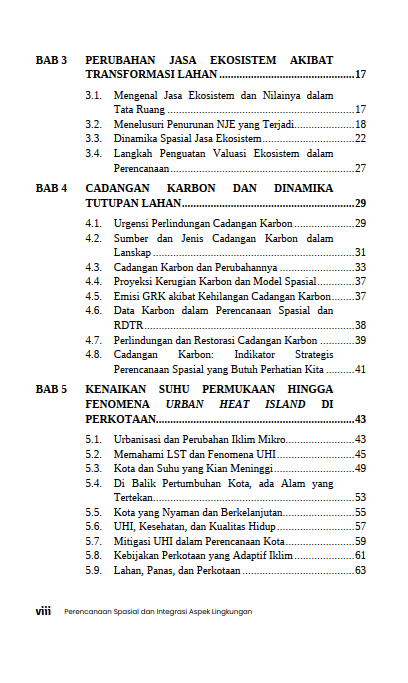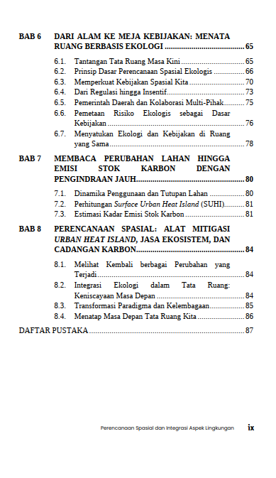 Buku ini menyelidiki perubahan cara perencanaan tata ruang dengan menyoroti signifikansi penggabungan dimensi ekologis dalam kebijakan ruang. Buku ini menjelaskan pengaruh perubahan penggunaan dan penutupan lahan (PTL) terhadap layanan ekosistem, simpanan karbon, dan suhu permukaan. Terdapat pernyataan bahwa perubahan fungsi lahan secara signifikan mengurangi nilai ekosistem, meningkatkan emisi karbon, dan memperburuk fenomena pulau panas kota (Urban Heat Island/UHI). Setiap bagian dalam buku ini membahas aspek-aspek berbeda yang saling berkaitan, mulai dari transformasi PTL, pengurangan nilai layanan ekosistem, hilangnya simpanan karbon, hingga konsep mitigasi UHI. Buku ini juga menyediakan struktur kebijakan tata ruang yang berlandaskan sudut pandang ekologis, mencakup zonasi ekologis, pemetaan risiko spasial, serta pengintegrasian indikator lingkungan dalam Rencana Tata Ruang Wilayah (RTRW) dan Rencana Detail Tata Ruang (RDTR). Melalui langkah-langkah akademis yang didasarkan pada konsep geospasial dan pemodelan, buku ini dirancang untuk mendukung pemerintah daerah, perencanaan tata ruang, dan pemangku kepentingan dalam merancang wilayah yang responsif terhadap perubahan iklim dan pembangunan yang berkelanjutan. Buku ini merekomendasikan perubahan dalam pengelolaan spasial yang tidak hanya berfokus pada efisiensi ekonomi, tetapi juga tahan terhadap tantangan ekologis.