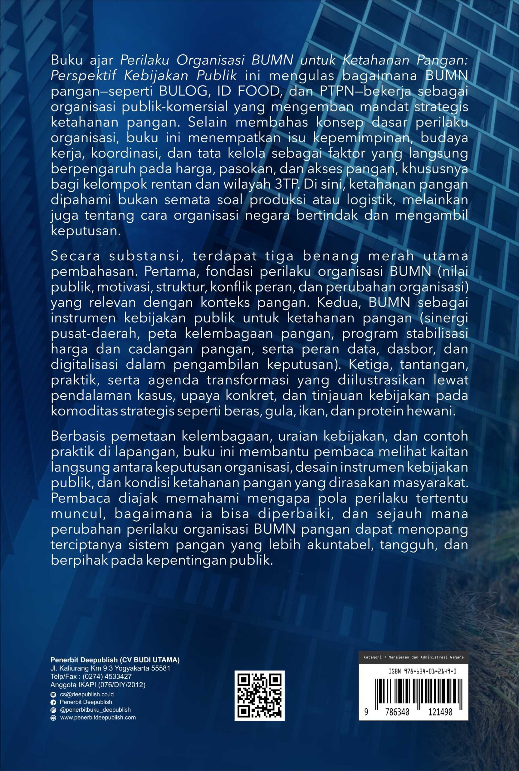 Buku Perilaku Organisasi BUMN untuk Ketahanan Pangan: Perspektif Kebijakan Publik diterbitkan oleh Penerbit Buku Pendidikan Deepublish.