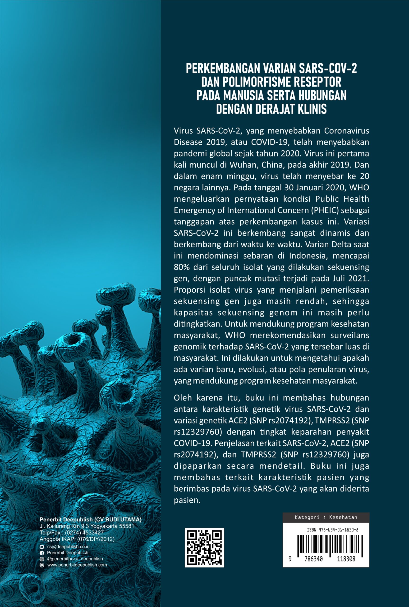 Buku Kesehatan yang berjudul Buku Perkembangan Varian Sars-Cov-2 dan Polimorfisme Reseptor Pada Manusia Serta Hubungan Dengan Derajat Klinis merupakan karya Rina Yunita, dkk. Virus SARS-CoV-2, yang menyebabkan Coronavirus Disease 2019, atau COVID-19, telah menyebabkan pandemi global sejak tahun 2020. Virus ini pertama kali muncul di Wuhan, China, pada akhir 2019. Dan dalam enam minggu, virus telah menyebar ke 20 negara lainnya. Pada tanggal 30 Januari 2020, WHO mengeluarkan pernyataan kondisi Public Health Emergency of International Concern (PHEIC) sebagai tanggapan atas perkembangan kasus ini. Variasi SARS-CoV-2 ini berkembang sangat dinamis dan berkembang dari waktu ke waktu. Varian Delta saat ini mendominasi sebaran di Indonesia, mencapai 80% dari seluruh isolat yang dilakukan sekuensing gen, dengan puncak mutasi terjadi pada Juli 2021. Proporsi isolat virus yang menjalani pemeriksaan sekuensing gen juga masih rendah, sehingga kapasitas sekuensing genom ini masih perlu ditingkatkan. Untuk mendukung program kesehatan masyarakat, WHO merekomendasikan surveilans genomik terhadap SARS-CoV-2 yang tersebar luas di masyarakat. Ini dilakukan untuk mengetahui apakah ada varian baru, evolusi, atau pola penularan virus, yang mendukung program kesehatan masyarakat.