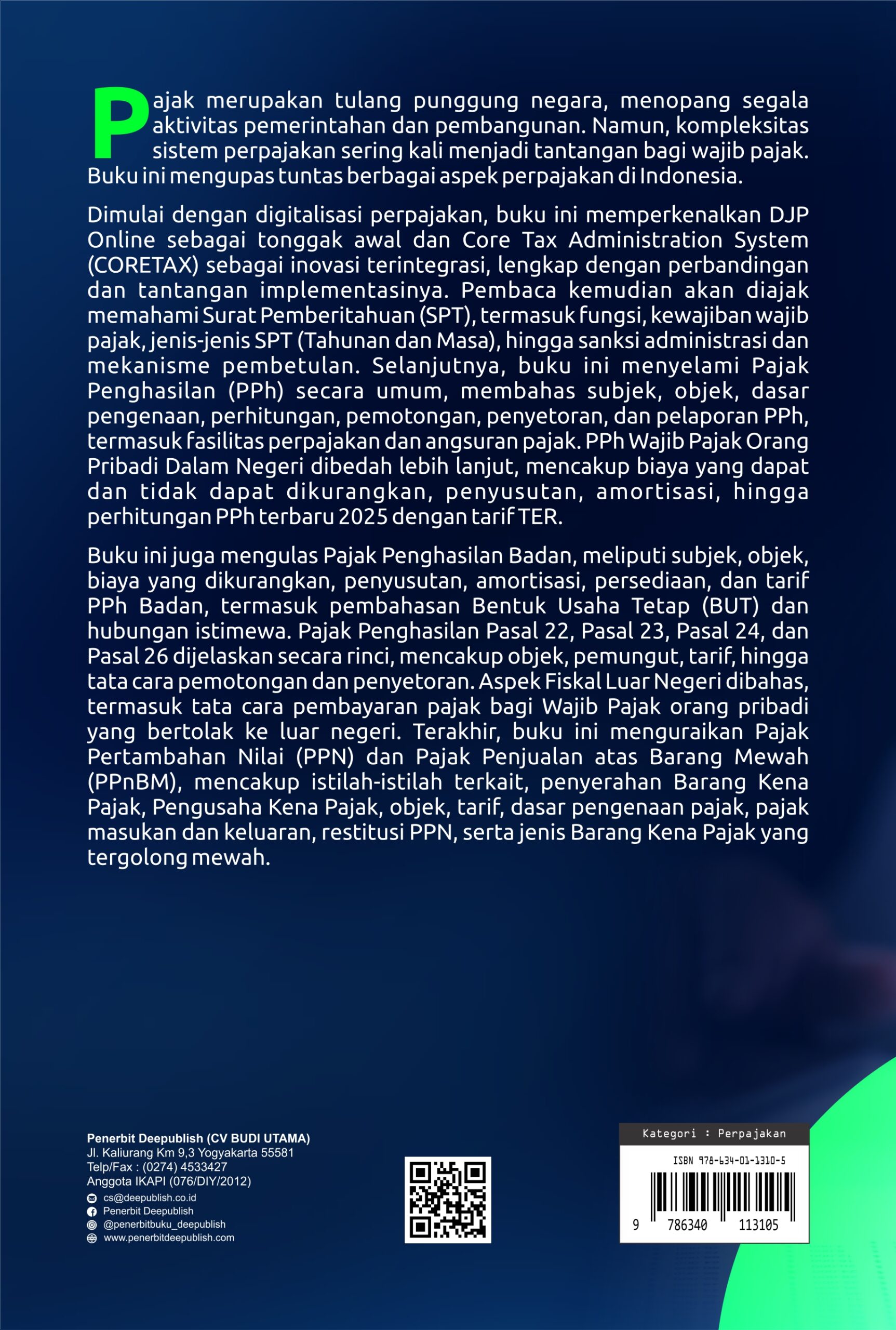 Buku Perpajakan yang berjudul Buku Perpajakan Indonesia merupakan karya Hamilah. Pajak merupakan tulang punggung negara, menopang segala aktivitas pemerintahan dan pembangunan. Namun, kompleksitas sistem perpajakan sering kali menjadi tantangan bagi wajib pajak. Buku ini mengupas tuntas berbagai aspek perpajakan di Indonesia. Dimulai dengan digitalisasi perpajakan, buku ini memperkenalkan DJP Online sebagai tonggak awal dan Core Tax Administration System (CORETAX) sebagai inovasi terintegrasi, lengkap dengan perbandingan dan tantangan implementasinya. Pembaca kemudian akan diajak memahami Surat Pemberitahuan (SPT), termasuk fungsi, kewajiban wajib pajak, jenis-jenis SPT (Tahunan dan Masa), hingga sanksi administrasi dan mekanisme pembetulan. Selanjutnya, buku ini menyelami Pajak Penghasilan (PPh) secara umum, membahas subjek, objek, dasar pengenaan, perhitungan, pemotongan, penyetoran, dan pelaporan PPh, termasuk fasilitas perpajakan dan angsuran pajak. PPh Wajib Pajak Orang Pribadi Dalam Negeri dibedah lebih lanjut, mencakup biaya yang dapat dan tidak dapat dikurangkan, penyusutan, amortisasi, hingga perhitungan PPh terbaru 2025 dengan tarif TER.