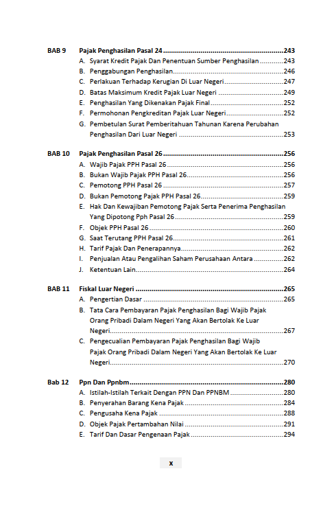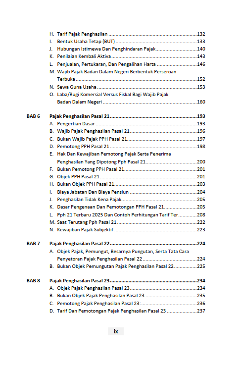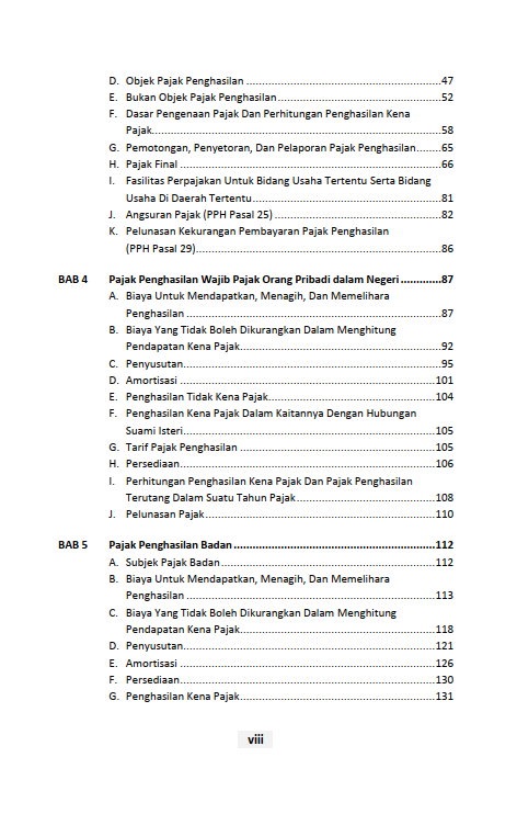 Buku ini juga mengulas Pajak Penghasilan Badan, meliputi subjek, objek, biaya yang dikurangkan, penyusutan, amortisasi, persediaan, dan tarif PPh Badan, termasuk pembahasan Bentuk Usaha Tetap (BUT) dan hubungan istimewa. Pajak Penghasilan Pasal 22, Pasal 23, Pasal 24, dan Pasal 26 dijelaskan secara rinci, mencakup objek, pemungut, tarif, hingga tata cara pemotongan dan penyetoran. Aspek Fiskal Luar Negeri dibahas, termasuk tata cara pembayaran pajak bagi Wajib Pajak orang pribadi yang bertolak ke luar negeri. Terakhir, buku ini menguraikan Pajak Pertambahan Nilai (PPN) dan Pajak Penjualan atas Barang Mewah (PPnBM), mencakup istilah-istilah terkait, penyerahan Barang Kena Pajak, Pengusaha Kena Pajak, objek, tarif, dasar pengenaan pajak, pajak masukan dan keluaran, restitusi PPN, serta jenis Barang Kena Pajak yang tergolong mewah. Buku Perpajakan Indonesia sangat cocok bagi para peneliti, mahasiswa, dan praktisi di bidang perpajakan dan ekonomi yang ingin mendalami aturan dan ketetapan perpajakan dengan peraturan ketetapan terbaru saat ini, mulai dari peraturan Menteri Keuangan, Peraturan Direktur Jenderal Pajak, sampai dengan surat edaran.