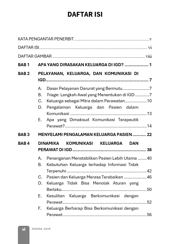 Buku Keperawatan yang berjudul Buku Perspektif Keluarga: Komunikasi dan Penanganan dalam Krisis di IGD merupakan karya Mokhtar Jamil. Pelayanan harus diberikan sesuai kompetensi dan kemampuan, artinya penanganan yang cepat dan tepat bagi pasien di IGD memerlukan standar pelayanan sesuai kompetensi dan kemampuan sehingga diperlukan standar pelayanan. Buku ini mengangkat kisah nyata yang sering luput dari sorotan, pengalaman keluarga pasien gawat darurat prioritas 2 (P2) dalam berinteraksi dengan perawat di Instalasi Gawat Darurat (IGD). Melalui sudut pandang keluarga, buku ini menelusuri harapan, kecemasan, dan kekecewaan mereka saat mendampingi orang terkasih di tengah kondisi kritis. Buku ini mengungkap pentingnya komunikasi yang hangat, jelas, dan berempati antara tenaga kesehatan dan keluarga pasien, terutama dalam situasi darurat yang penuh tekanan emosional.