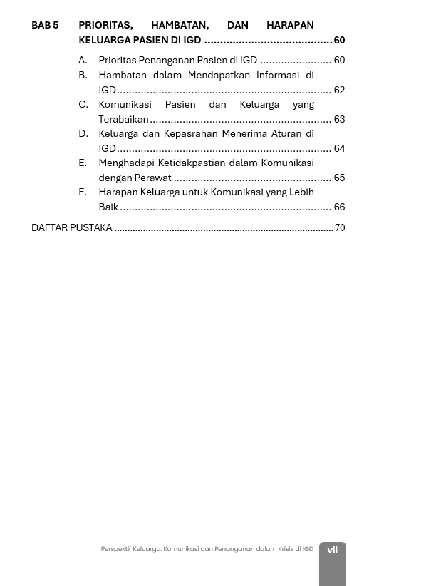 Berikut Daftar Isi Buku Keperawatan yang berjudul Buku Perspektif Keluarga: Komunikasi dan Penanganan dalam Krisis di IGD, diantaranya: