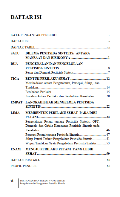Berikut Daftar Isi Buku Pertanian yang berjudul Buku Pertanian dan Petani yang Sehat: Pengelolaan dan Penggunaan Pestisida Sintetis, diantaranya: