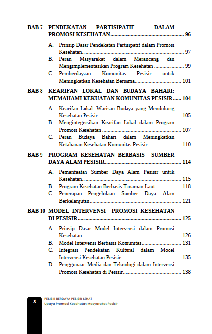 Buku ini menguraikan secara komprehensif dinamika kehidupan masyarakat pesisir dan tantangan kesehatan yang mereka hadapi. Pembahasan ini menunjukkan bahwa permasalahan kesehatan di wilayah pesisir adalah isu multidimensi yang tidak bisa diatasi dengan pendekatan tunggal. Buku ini juga memaparkan berbagai strategi promosi kesehatan yang terbukti efektif untuk komunitas pesisir. Penekanan diberikan pada cara partisipatif yang memberdayakan masyarakat sebagai subjek pembangunan, bukan hanya objek.