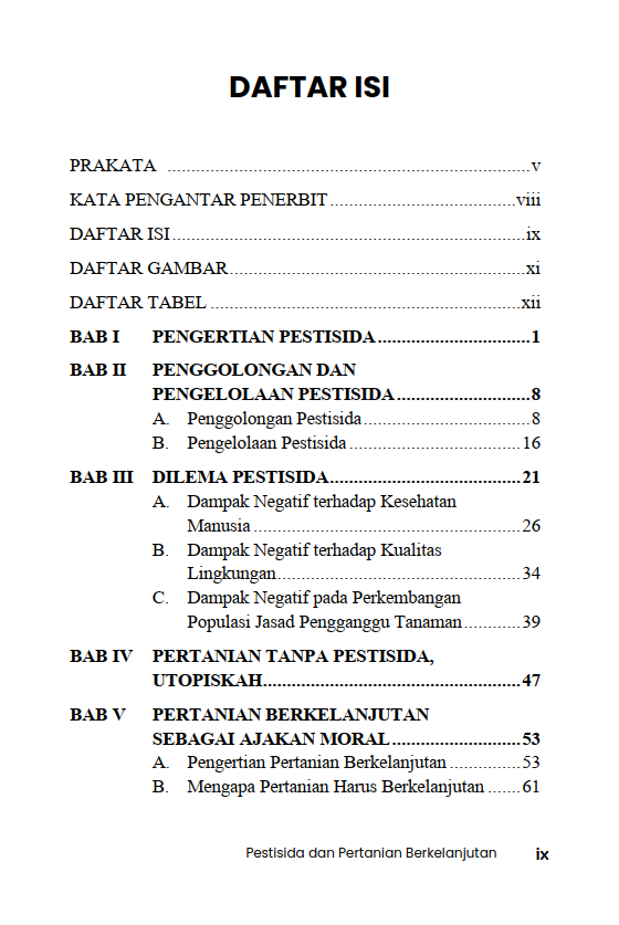 Sinopsis Buku Pestisida dan Pertanian Berkelanjutan (Upaya Memahami Perilaku Petani Dalam Pengelolaan Hama) Buku Pestisida dan Pertanian Berkelanjutan (Upaya Memahami Perilaku Petani Dalam Pengelolaan Hama) Buku Pertanian yang berjudul Buku Pestisida dan Pertanian Berkelanjutan (Upaya Memahami Perilaku Petani Dalam Pengelolaan Hama) merupakan karya Kasman Jaya dan Ratnawati. Buku ini terdiri dari Buku ini terdiri dari 9 bab. Pertama, membahas mengenai pengertian pestisida. Kedua, penggolongan dan pengelolaan pestisida. Ketiga, dilema pestisida. Keempat, pertanian tanpa pestisida, utopiskah? Kelima, pertanian berkelanjutan sebagai ajakan moral. Keenam, model sistem pertanian berkelanjutan. Ketujuh, perilaku pragmatis petani. Kedelapan, faktor-faktor memengaruhi perilaku petani. Kesembilan, penutup. Dalam buku ini, Upaya untuk meningkatkan ketahanan pangan melalui intensifikasi pertanian memang begitu populer dikalangan para perencana dan penentu kebijakan pembangunan pertanian di Indonesia. Artinya menjaga ketahanan pangan hanya “cenderung” memaksimalkan variabel tunggal seperti input energi (pupuk dan pestisida) dalam produksi pertanian. Ketergantungan, akhirnya itu kini begitu nyata. Penggunaan bahan kimia, khususnya pestisida di tingkat petani begitu tinggi. Namun kehadiran ternyata tak sekadar memberi manfaat, memproteksi tanaman budidaya, namun juga membawah dampak negatif yang mengancam keberlanjutan makhluk hidup lainnya, termasuk manusia. Ada upaya membatasinya dan bahkan menggantikannya, namun upaya itu belum juga seperti yang diharapkan. Diperlukan aksi nyata yang terencana, tertata dan terselenggara dengan baik dalam masyarakat pertanian secara luas dengan menekankan upaya pengelolaan hama (OPT) yang sustainable (berkelanjutan). Buku ini bukan hanya memperluas wawasan tentang pengelolaan pestisida dan pertanian berkelanjutan, tetapi juga menggugah pembaca untuk menghargai dan menyelamatkan sumber daya pertanian. Penyebarluasan adopsi pertanian berkelanjutan memerlukan peningkatan kesadaran dan pemahaman dari petani tentang potensi manfaat dari sistem pertanian berkelanjutan. Yang pada gilirannya memerlukan peningkatan akses informasi dan pendidikan serta program pelatihan tentang pertanian berkelanjutan bagi petani dan penyuluh pertanian, dan tentu saja memerlukan dukungan kelembagaan dan jaringan formal maupun informal dari petani. Dan buku ini mencoba mengingatkan kembali peran penting pemerintah, dalam menjaga keberlanjutan sumber daya pertanian di negeri yang kita cintai ini. Berikut Daftar Isi Buku Pertanian yang berjudul Buku Pestisida dan Pertanian Berkelanjutan (Upaya Memahami Perilaku Petani Dalam Pengelolaan Hama), diantaranya: