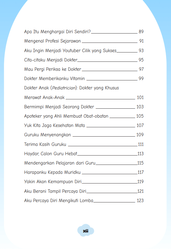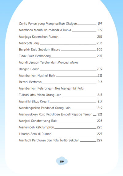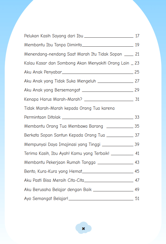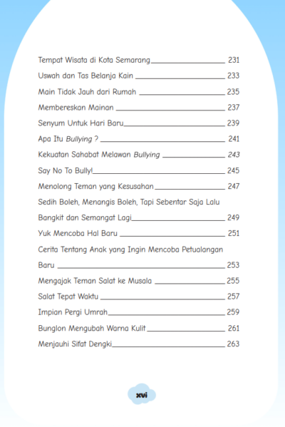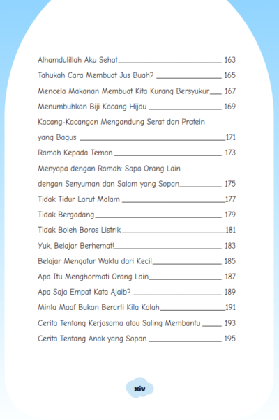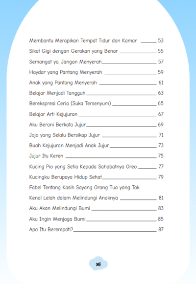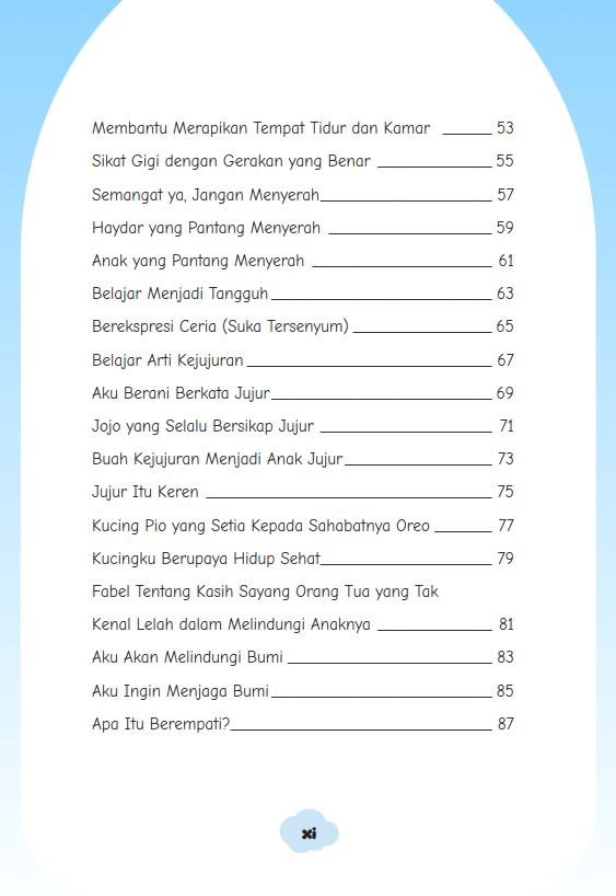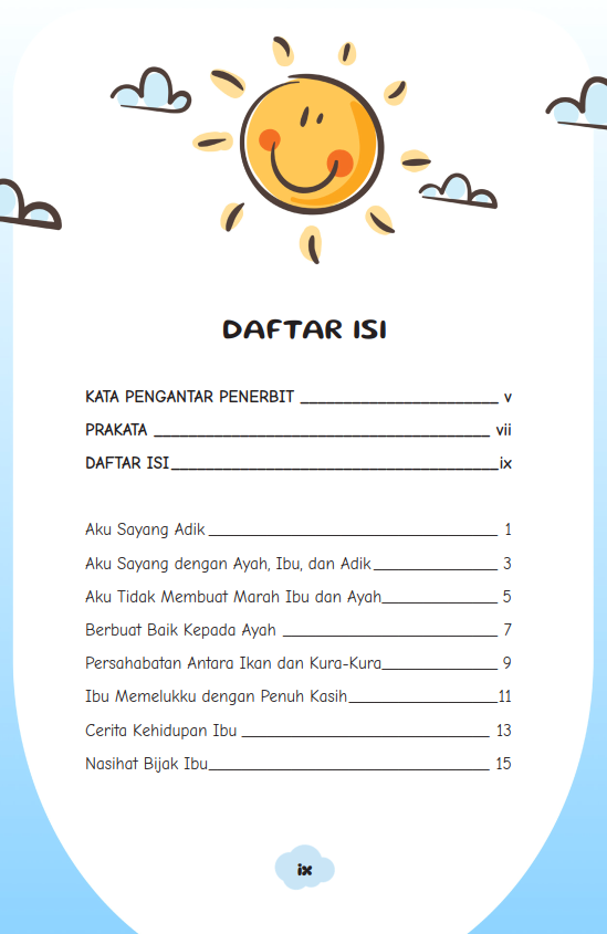 Diharapkan buku ini dapat menjadi teman setia bagi anak-anak dalam perjalanan mereka tumbuh, berproses, dan belajar. Semoga setiap cerita yang ditulis dalam buku ini, dapat menumbuhkan semangat kebaikan dalam diri anak dan menginspirasi untuk selalu berbuat baik. Selamat membaca dan semoga menyenangkan.