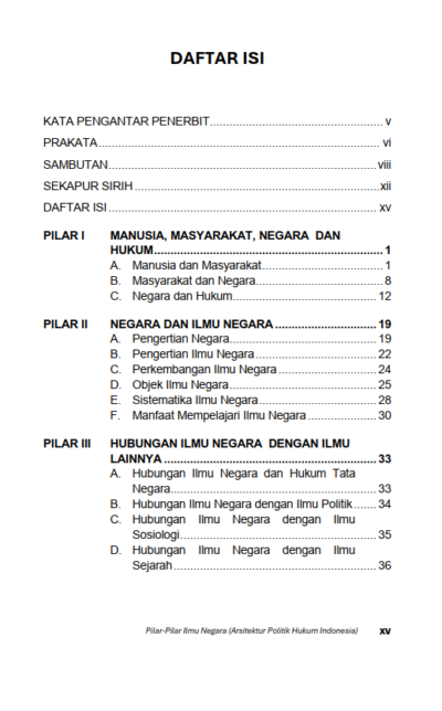 Sinopsis Buku Pilar-Pilar Ilmu Negara (Arsitektur Politik Hukum Indonesia) Buku Pilar-Pilar Ilmu Negara (Arsitektur Politik Hukum Indonesia) Buku Pilar-Pilar Ilmu Negara (Arsitektur Politik Hukum Indonesia) ini mengulas tentang dasar-dasar ilmu negara sebagai landasan pembangunan negara yang kokoh dan sejahtera. Ilmu negara memiliki kemiripan dengan ilmu arsitektur dalam membangun sebuah bangunan indah dengan fondasi dan struktur yang kuat. Seperti seorang arsitek yang merancang bangunan agar tidak hanya megah tetapi juga tahan lama dan dapat melaksanakan fungsi bangunan itu dengan baik, ilmu negara berupaya menciptakan sistem pemerintahan, hukum, dan kebijakan yang stabil, adil, serta mampu bertahan menghadapi perubahan zaman. Ilmu negara berperan sebagai pilar utama dalam arsitektur politik hukum, membentuk struktur yang menopang ketertiban, keadilan, dan kestabilan dalam suatu negara. Seperti halnya arsitektur yang membutuhkan desain yang matang dan material yang kokoh, politik hukum juga harus didasarkan pada prinsip-prinsip fundamental seperti supremasi hukum, demokrasi, dan keseimbangan kekuasaan. Dengan perencanaan yang matang, kepemimpinan yang visioner, serta keterlibatan masyarakat yang aktif, sebuah negara bisa menjadi seperti bangunan megah yang berdiri tegak, mampu mewujudkan kesejahteraan bagi semua dan bertahan sepanjang sejarah. Berikut Daftar Isi Buku Hukum yang berjudul Buku Pilar-Pilar Ilmu Negara (Arsitektur Politik Hukum Indonesia), diantaranya: