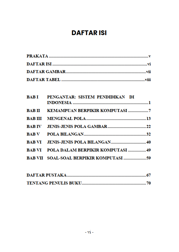 Berikut Daftar Isi Buku Matematika yang berjudul Buku Pola Gambar dan Pola Bilangan untuk Meningkatkan Kemampuan Berpikir Komputasi Siswa SD, diantaranya: