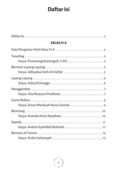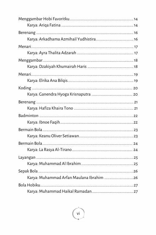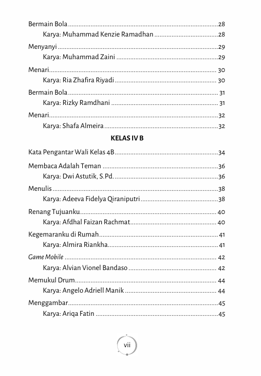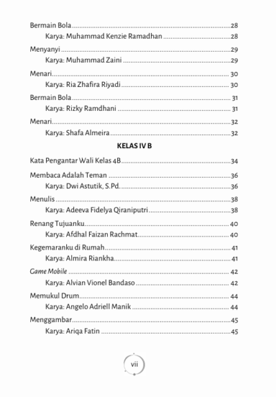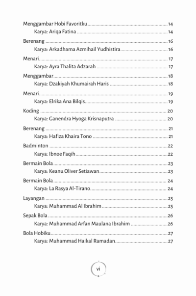 Buku ini merupakan kumpulan puisi dari siswa kelas IV sekolah dasar dengan tema “Kegemaranku”. Setiap halamannya berisi kisah kecil kebahagiaan anak-anak yang terjalin dalam kegemaran mereka masing-masing. Puisi-puisi ini menjadi jendela ajaib yang membuka dunia imajinatif siswa, dari kesukaan terhadap bermain layang-layang, menyanyi, bermain, hingga berolahraga. Melalui ekspresi kreatif dan sederhana, buku ini memaparkan keindahan dan kegembiraan yang tersimpan dalam setiap detik kehidupan, mengajak pembaca untuk menyelami keunikan masing-masing kegemaran dengan semangat anak-anak yang penuh ceria.
