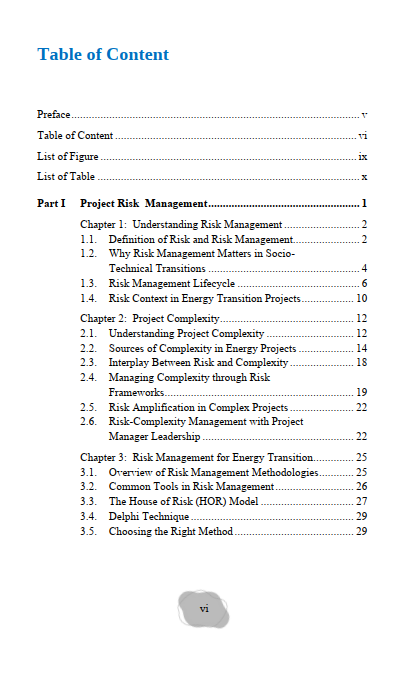 Part I gently guides readers through what “risk” really means: why things can go wrong, why it matters to think ahead, and how planning helps projects run more smoothly. It also shows how energy transitions can be especially tricky, involving not just technology but also people’s habits, expectations, and changing regulations. The book then looks at why some projects feel more complicated than others and how that complexity can make small problems grow. A few easy-to-understand methods for organizing and anticipating risks are introduced to help readers see how professionals approach uncertainty.