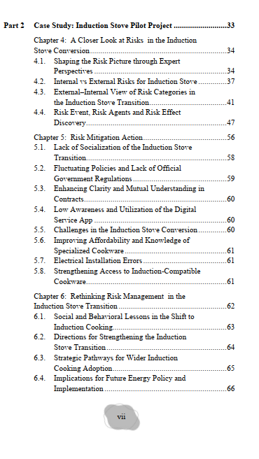 Part II brings the topic closer to home with a case study on the induction stove conversion program. It shares insights from experts, explains the kinds of challenges that appear both inside the project and from the outside world, and lays out the possible risks in a simple, relatable way. The book then describes practical solutions, from improving communication with households to making cookware more affordable, ensuring good electrical installations, and helping people become comfortable with new digital tools.