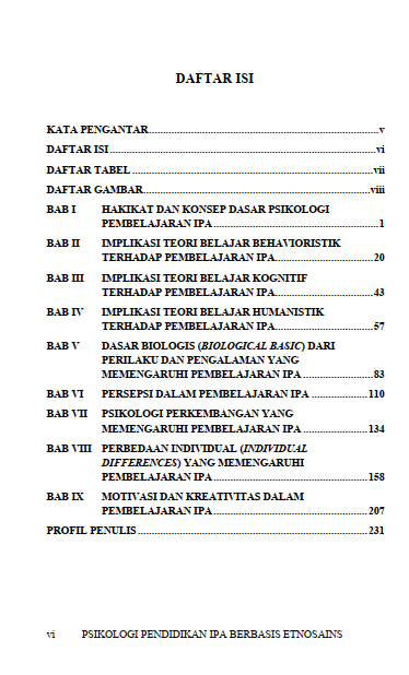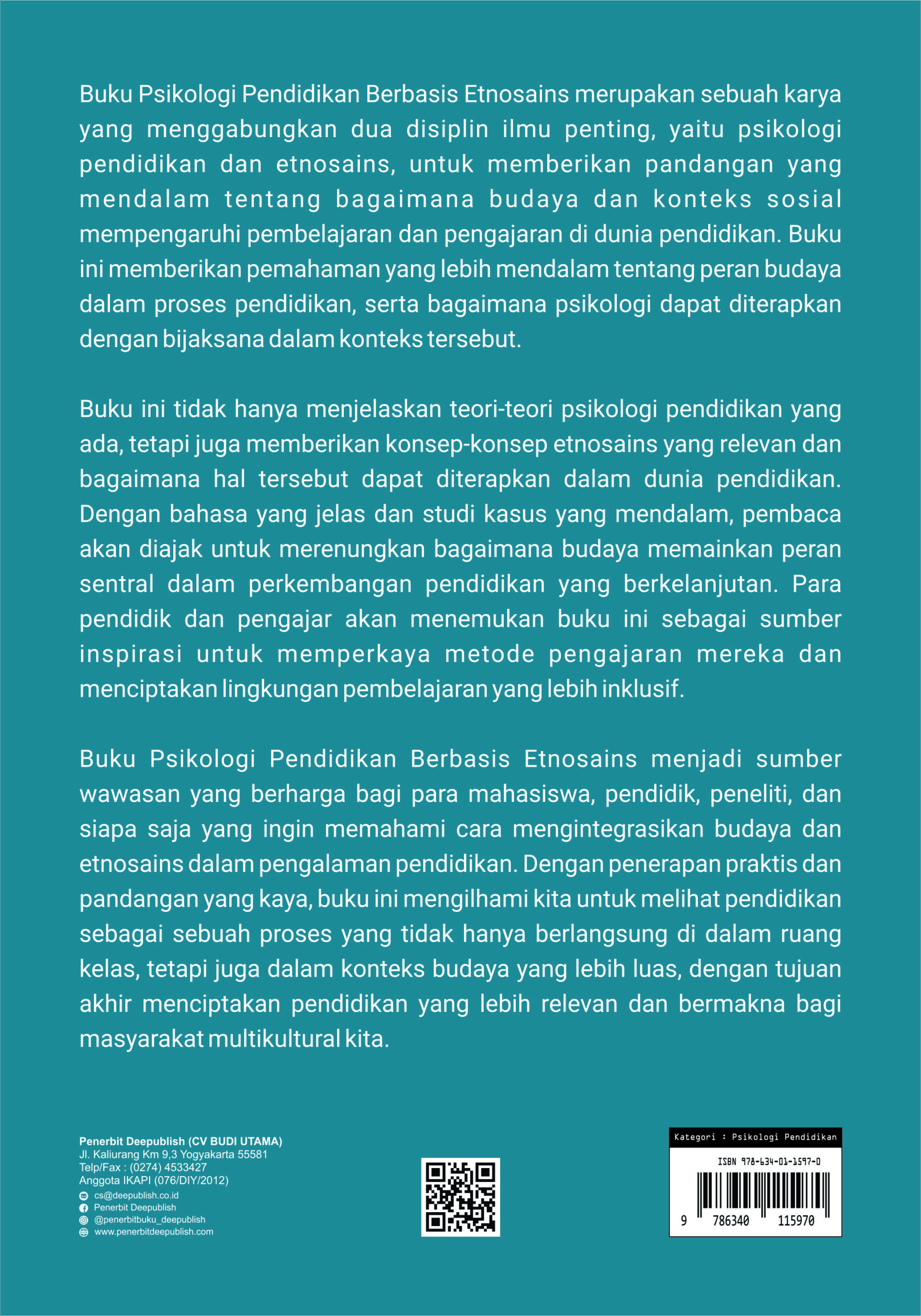Sinopsis Buku Psikologi Pendidikan IPA Berbasis Etnosains Buku Psikologi Pendidikan IPA Berbasis Etnosains Buku Pendidikan yang berjudul Buku Psikologi Pendidikan Ipa Berbasis Etnosains merupakan karya Lufri, dkk. Buku ini merupakan sebuah karya yang menggabungkan dua disiplin ilmu penting, yaitu psikologi pendidikan dan etnosains, untuk memberikan pandangan yang mendalam tentang bagaimana budaya dan konteks sosial mempengaruhi pembelajaran dan pengajaran di dunia pendidikan. Buku ini memberikan pemahaman yang lebih mendalam tentang peran budaya dalam proses pendidikan, serta bagaimana psikologi dapat diterapkan dengan bijaksana dalam konteks tersebut. Buku ini tidak hanya menjelaskan teori-teori psikologi pendidikan yang ada, tetapi juga memberikan konsep-konsep etnosains yang relevan dan bagaimana hal tersebut dapat diterapkan dalam dunia pendidikan. Dengan bahasa yang jelas dan studi kasus yang mendalam, pembaca akan diajak untuk merenungkan bagaimana budaya memainkan peran sentral dalam perkembangan pendidikan yang berkelanjutan. Para pendidik dan pengajar akan menemukan buku ini sebagai sumber inspirasi untuk memperkaya metode pengajaran mereka dan menciptakan lingkungan pembelajaran yang lebih inklusif. Buku Psikologi Pendidikan IPA Berbasis Etnosains menjadi sumber wawasan yang berharga bagi para mahasiswa, pendidik, peneliti, dan siapa saja yang ingin memahami cara mengintegrasikan budaya dan etnosains dalam pengalaman pendidikan. Dengan penerapan praktis dan pandangan yang kaya, buku ini mengilhami kita untuk melihat pendidikan sebagai sebuah proses yang tidak hanya berlangsung di dalam ruang kelas, tetapi juga dalam konteks budaya yang lebih luas, dengan tujuan akhir menciptakan pendidikan yang lebih relevan dan bermakna bagi masyarakat multikultural kita. Berikut Daftar Isi Buku Pendidikan yang berjudul Buku Psikologi Pendidikan IPA Berbasis Etnosains, diantaranya: