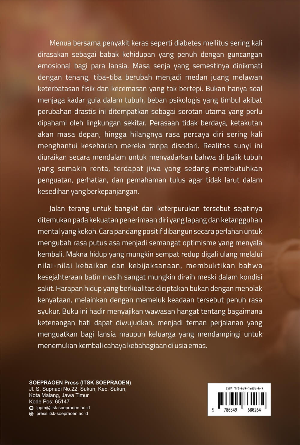 Jalan terang untuk bangkit dari keterpurukan tersebut sejatinya ditemukan pada kekuatan penerimaan diri yang lapang dan ketangguhan mental yang kokoh. Cara pandang positif dibangun secara perlahan untuk mengubah rasa putus asa menjadi semangat optimisme yang menyala kembali. Makna hidup yang mungkin sempat redup digali ulang melalui nilai-nilai kebaikan dan kebijaksanaan, membuktikan bahwa kesejahteraan batin masih sangat mungkin diraih meski dalam kondisi sakit. Harapan hidup yang berkualitas diciptakan bukan dengan menolak kenyataan, melainkan dengan memeluk keadaan tersebut penuh rasa syukur. Buku ini hadir menyajikan wawasan hangat tentang bagaimana ketenangan hati dapat diwujudkan, menjadi teman perjalanan yang menguatkan bagi lansia maupun keluarga yang mendampingi untuk menemukan kembali cahaya kebahagiaan di usia emas. Buku Psikoterapi Positif: Upaya untuk Meningkatkan Optimisme dan Penerimaan Diri pada Lansia Penderita Diabetes ini layak dijadikan sebagai referensi esensial bagi akademisi, praktisi kesehatan, dan keluarga dalam memahami bahwa kesejahteraan lansia bermula dari kesiapan psikologis dalam menerima kondisi dirinya.