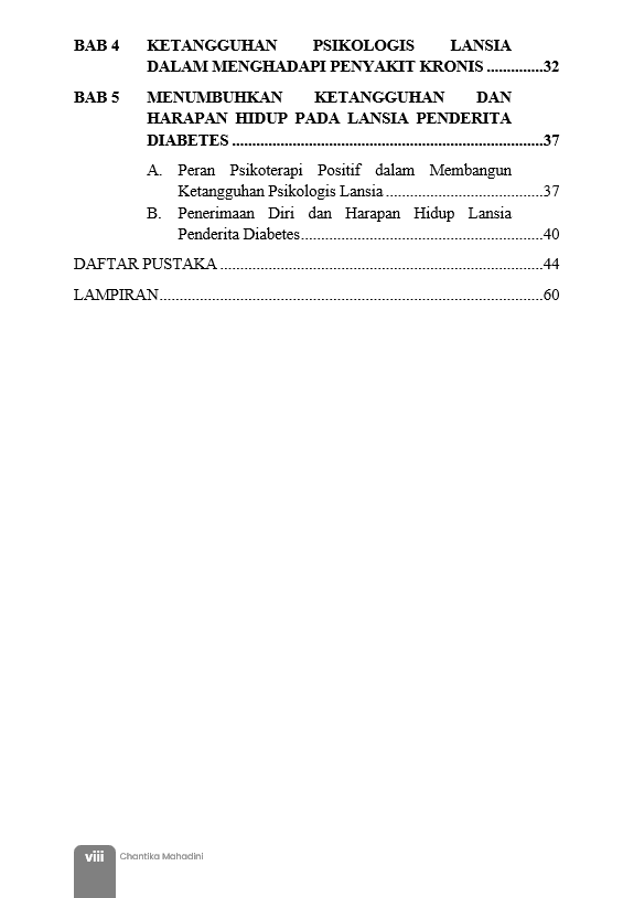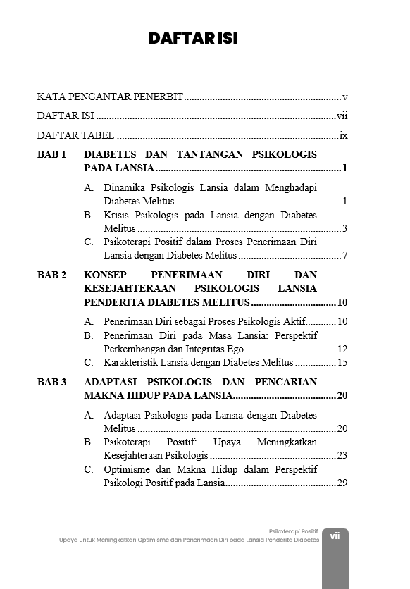 Berikut Daftar Isi Buku Kesehatan yang berjudul Buku Psikoterapi Positif: Upaya untuk Meningkatkan Optimisme dan Penerimaan Diri pada Lansia Penderita Diabetes, diantaranya: