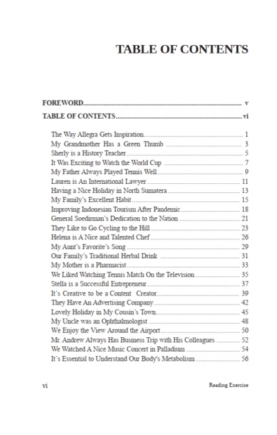 Nowadays, English as international language has been an important knowledge especially in this global era. English proficiency support people’s achievement in their educational level and professional career. The author would like to complete the English learning material to support the idea by this Reading Exercise where we can learn English through reading comprehension method. It is possible to be applied by teachers and students, whether learning individually, in general class or in a convinience conversation class.