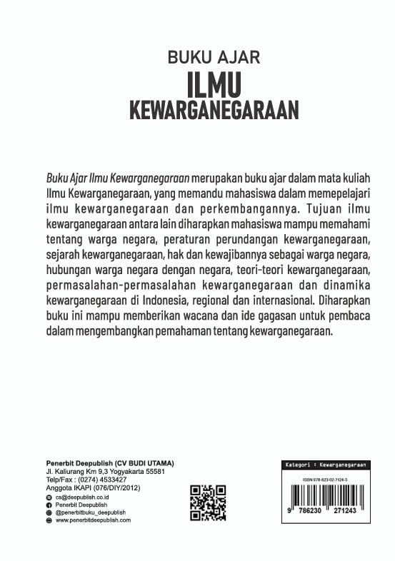 Buku Ajar Ilmu Kewarganegaraan ini diterbitkan oleh Penerbit Buku Pendidikan Deepublish.