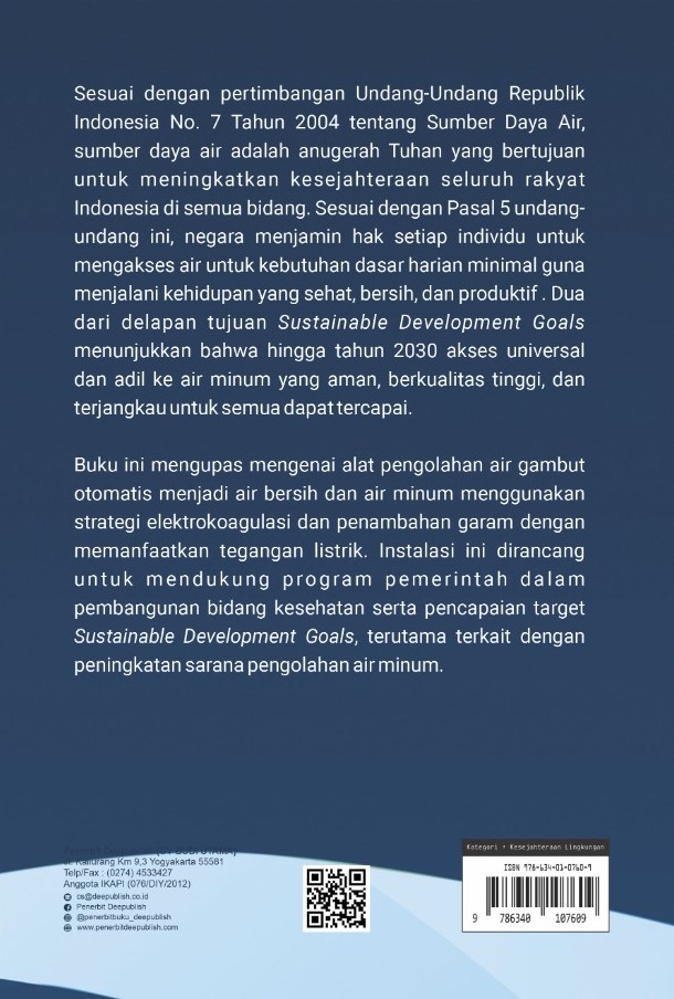 Buku ini mengupas mengenai alat pengolahan air gambut otomatis menjadi air bersih dan air minum menggunakan strategi elektrokoagulasi dan penambahan garam dengan memanfaatkan tegangan listrik. Instalasi ini dirancang untuk mendukung program pemerintah dalam pembangunan bidang kesehatan serta pencapaian target Sustainable Development Goals, terutama terkait dengan peningkatan sarana pengolahan air minum.