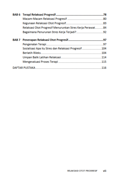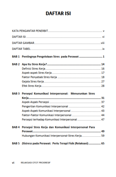 Berikut Daftar Isi Buku Keperawatan yang berjudul Buku Relaksasi Otot Progresif: Solusi Efektif untuk Mengatasi Stres Pada Perawat, diantaranya: