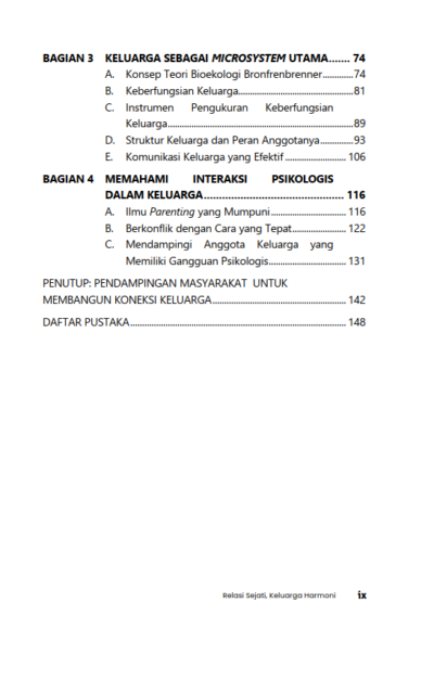 Sinopsis Buku Relasi Sejati, Keluarga Harmoni Buku Relasi Sejati, Keluarga Harmoni Buku Psikologi yang berjudul Buku Relasi Sejati, Keluarga Harmoni merupakan karya Pradipta Christy Pratiwi, Siti Nuzulia, Anna Undarwati, Ade Risna Puja Muslimah, dkk. Keluarga seharusnya menjadi sistem pendukung utama dalam menjaga stabilitas kesehatan mental individu. Namun, realitasnya, banyak keluarga menghadapi berbagai masalah seperti konflik berkepanjangan, kekerasan, dan perceraian, yang justru menjadi sumber utama masalah kesehatan mental. Kondisi keluarga yang tidak harmonis sering kali menjadi pemicu munculnya masalah psikologis pada individu. Sayangnya, tidak jarang keluarga menolak untuk terlibat dalam terapi keluarga ketika salah satu anggotanya mengalami masalah kesehatan mental. Buku ini hadir sebagai upaya untuk meningkatkan kesadaran masyarakat tentang pentingnya keterkaitan antara kesehatan mental individu, relasi romantis, dan relasi keluarga dalam menjaga kesehatan mental secara luas. Dengan bahasa yang sederhana, buku ini diharapkan dapat memberikan pemahaman kepada keluarga tentang pentingnya menjaga kesehatan psikologis anggota keluarga. Berikut Daftar Isi Buku Psikologi yang berjudul Buku Relasi Sejati, Keluarga Harmoni, diantaranya: