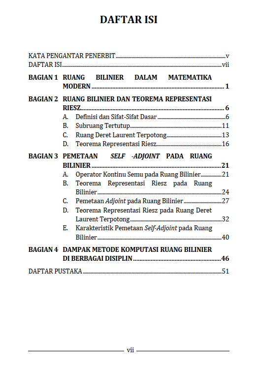 Berikut Daftar Isi Buku Matematika berjudul Buku Ruang Bilinier: Mengupas Karakteristik Operator Adjoint dan Manfaatnya di Berbagai Disiplin, diantaranya: