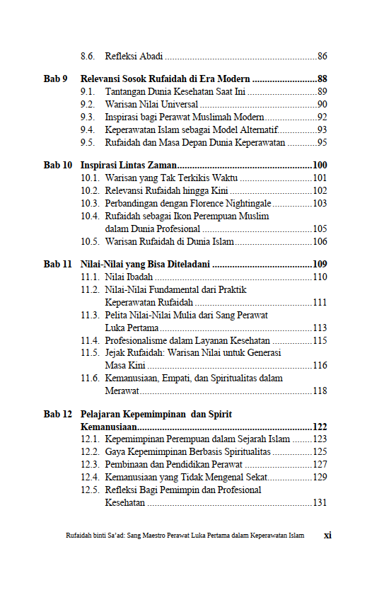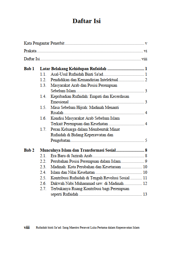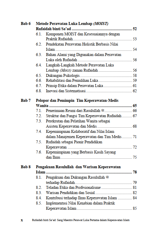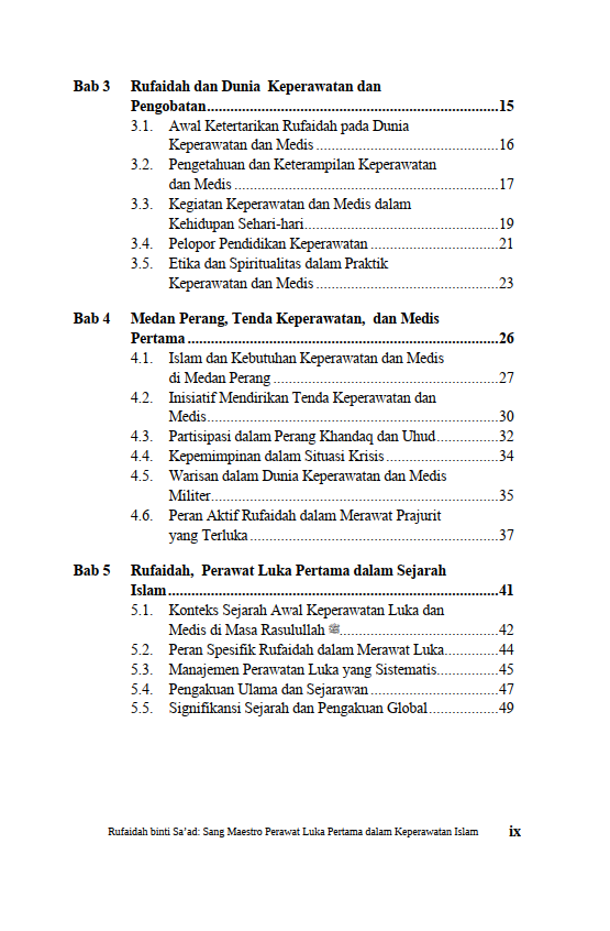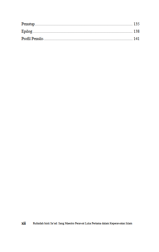 Berikut Daftar Isi Buku Keperawatan yang berjudul Buku Rufaidah binti Sa’ad: Sang Maestro Perawat Luka Pertama dalam Keperawatan Islam (Menguak Jejak Perintis Keperawatan Islam dari Medan Perang ke Pusat Peradaban Perawatan Luka Dunia), diantaranya: