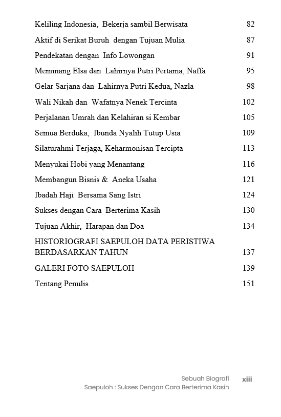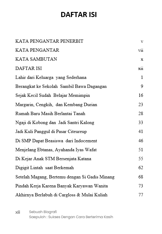 Berikut Daftar Isi Buku Sebuah Biografi Saepuloh : Sukses dengan Cara Berterima Kasih, diantaranya: