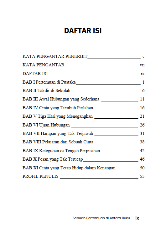 Berikut Daftar Isi Buku Novel yang berjudul Buku Sebuah Pertemuan di Antara Buku, diantaranya: