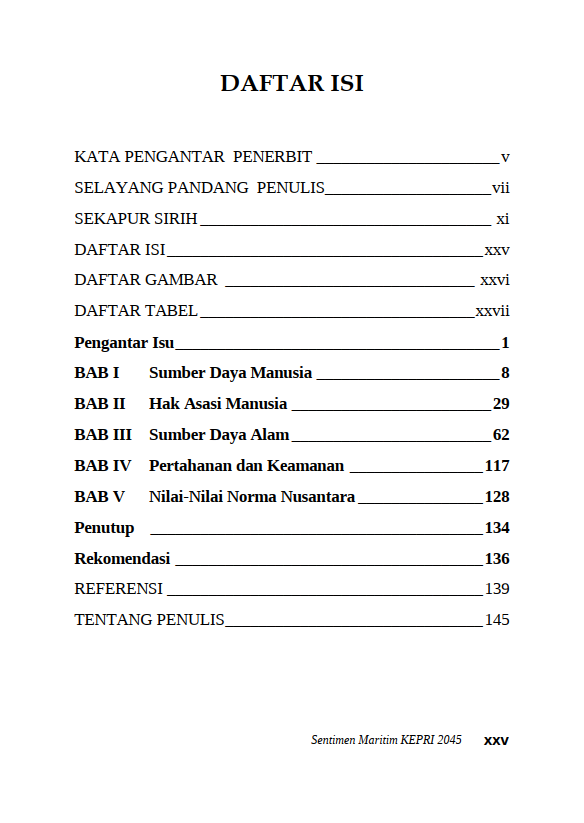 Berikut Daftar Isi Buku Administrasi Negara yang berjudul Buku Sentimen Maritim: Kepulauan Riau 2045, diantaranya:
