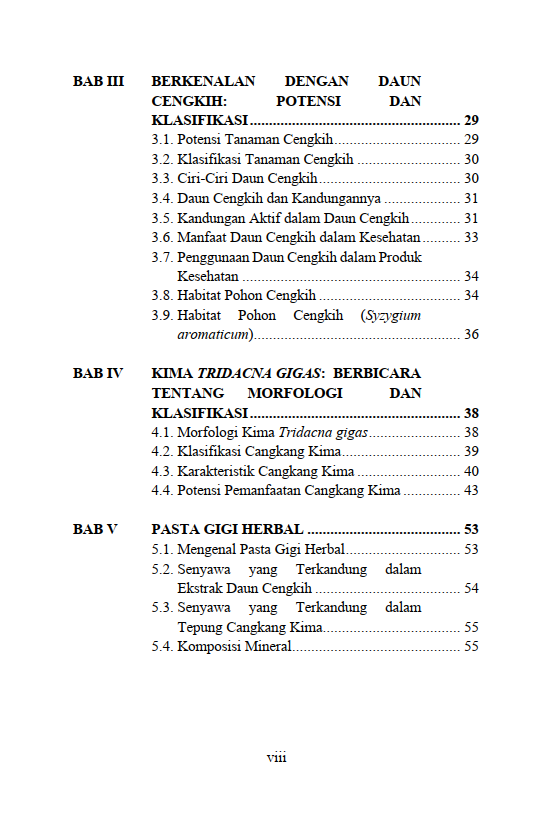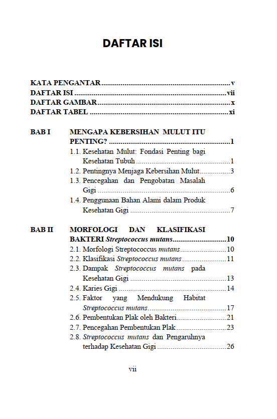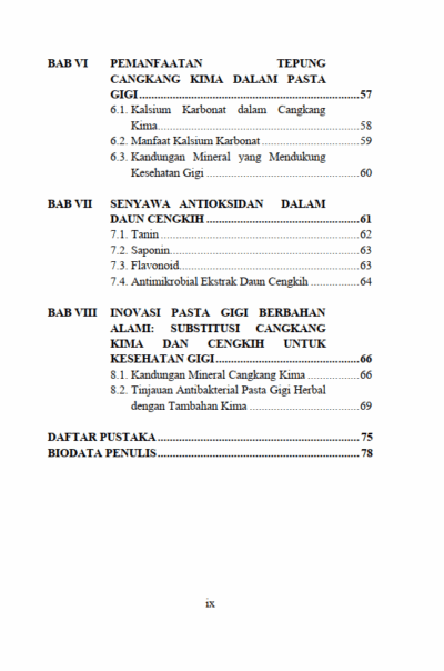 Sinopsis Buku Senyum Alami, Bebas Karies: Inovasi Pasta Gigi dari Cangkang Kima & Cengkih Buku Senyum Alami, Bebas Karies: Inovasi Pasta Gigi dari Cangkang Kima & Cengkih Buku Sains dan Teknologi yang berjudul Buku Senyum Alami, Bebas Karies: Inovasi Pasta Gigi dari Cangkang Kima & Cengkih merupakan karya Nurainy Kaliky. Streptococcus mutans (S. mutans), menjadi salah satu masalah kesehatan yang umum terjadi di masyarakat. Keberadaan bakteri ini dapat memicu pembentukan plak gigi, karies, dan kerusakan gigi lainnya. Oleh karena itu, solusi inovatif untuk mengatasi masalah ini sangat penting. Salah satu alternatif yang menjanjikan adalah dengan memanfaatkan bahan alami sebagai bahan baku produk perawatan gigi. Inovasi pasta gigi herbal yang terbuat dari limbah cangkang kima dan ekstrak cengkih dalam menangkal S. mutans untuk menjaga kesehatan gigi dan mulut. Cangkang kima, yang sering kali dianggap sebagai limbah, ternyata memiliki kandungan bioaktif yang potensial untuk memerangi bakteri penyebab kerusakan gigi. Dengan memanfaatkan sumber daya alam yang terbarukan dan ramah lingkungan, produk ini tidak hanya berpotensi efektif dalam menangkal S. mutans, tetapi juga dapat memberikan dampak positif bagi lingkungan dengan mengurangi limbah. Inovasi pasta gigi herbal yang terbuat dari limbah cangkang kima dan ekstrak cengkih dalam menangkal S. mutans untuk menjaga kesehatan gigi dan mulut. Cangkang kima, yang sering kali dianggap sebagai limbah, ternyata memiliki kandungan bioaktif yang potensial untuk memerangi bakteri penyebab kerusakan gigi. Dengan memanfaatkan sumber daya alam yang terbarukan dan ramah lingkungan, produk ini tidak hanya berpotensi efektif dalam menangkal S. mutans, tetapi juga dapat memberikan dampak positif bagi lingkungan dengan mengurangi limbah. Buku Senyum Alami, Bebas Karies: Inovasi Pasta Gigi dari Cangkang Kima & Cengkih sangat cocok bagi para peneliti, mahasiswa, dan praktisi di bidang sains, teknologi, maupun kesehatan gigi yang ingin memperkaya wawasan mengenai kesehatan mulut dan gigi dan juga mendalami tentang inovasi pada pasta gigi. Berikut Daftar Isi Buku Sains dan Teknologi yang berjudul Buku Senyum Alami, Bebas Karies: Inovasi Pasta Gigi dari Cangkang Kima & Cengkih, diantaranya: