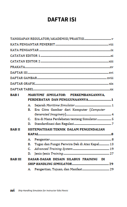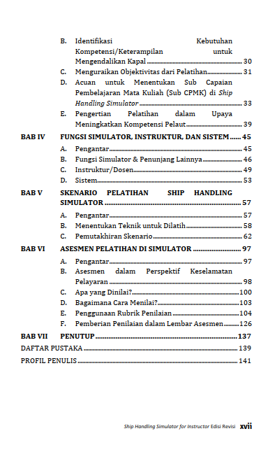 Lebih dari sekadar pengenalan, buku ini membawa pembaca masuk ke ruang kontrol. Anda akan diajak memahami bagaimana sebuah program pelatihan di simulator dirancang dari awal. Dimulai dari mengurai tugas dan fungsi seorang perwira dek, hingga merancang silabus dan skenario pelatihan yang menantang. Apa saja yang harus dilatihkan? Bagaimana peran seorang instruktur dalam memandu jalannya simulasi? Bagian ini juga memaparkan berbagai fungsi teknis dari simulator itu sendiri. Terakhir, buku ini menjelaskan bagaimana para peserta didik dinilai. Ini adalah bagian penting untuk memastikan bahwa mereka benar-benar siap dan terampil dalam mengambil keputusan di saat-saat genting sebelum mereka benar-benar berlayar.