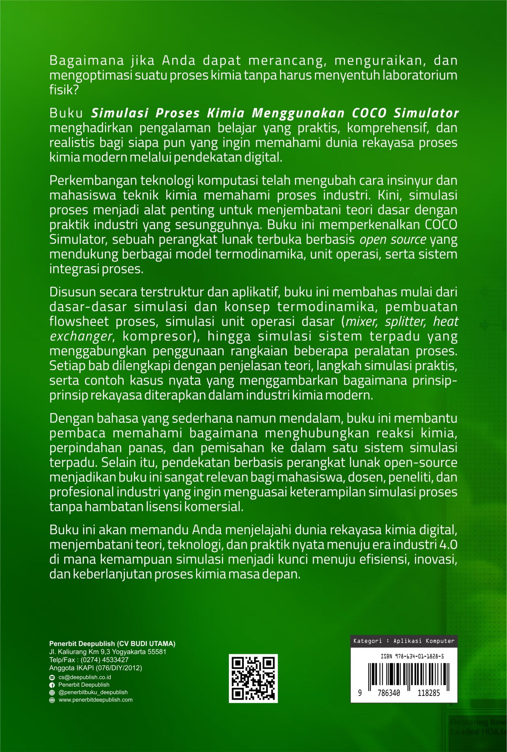 Bagaimana jika Anda dapat merancang, menguraikan, dan mengoptimasi suatu proses kimia tanpa harus menyentuh laboratorium fisik? Buku Teknik Kimia yang berjudul Buku Simulasi Proses Kimia Menggunakan Coco Simulator merupakan karya Takdir Syarif, Andi Aladin dan Munira. Buku ini menghadirkan pengalaman belajar yang praktis, komprehensif, dan realistis bagi siapa pun yang ingin memahami dunia rekayasa proses kimia modern melalui pendekatan digital. Perkembangan teknologi komputasi telah mengubah cara insinyur dan mahasiswa teknik kimia memahami proses industri. Kini, simulasi proses menjadi alat penting untuk menjembatani teori dasar dengan praktik industri yang sesungguhnya. Buku ini memperkenalkan COCO Simulator, sebuah perangkat lunak terbuka berbasis open source yang mendukung berbagai model termodinamika, unit operasi, serta sistem integrasi proses. Disusun secara terstruktur dan aplikatif, buku ini membahas mulai dari dasar-dasar simulasi dan konsep termodinamika, pembuatan flowsheet proses, simulasi unit operasi dasar (mixer, splitter, heat exchanger, kompresor), hingga simulasi sistem terpadu yang menggabungkan penggunaan rangkaian beberapa peralatan proses. Setiap bab dilengkapi dengan penjelasan teori, langkah simulasi praktis, serta contoh kasus nyata yang menggambarkan bagaimana prinsip-prinsip rekayasa diterapkan dalam industri kimia modern. Buku Simulasi Proses Kimia Menggunakan Coco Simulator sangat cocok menjadi referensi akademik dalam mata kuliah Simulasi Proses Kimia juga menjadi sumber rujukan bagi praktisi industri yang ingin mengimplementasikan simulasi sebagai alat analisis dan optimasi proses. Dengan bahasa yang sederhana namun mendalam, buku ini membantu pembaca memahami bagaimana menghubungkan reaksi kimia, perpindahan panas, dan pemisahan ke dalam satu sistem simulasi terpadu. Selain itu, pendekatan berbasis perangkat lunak open-source menjadikan buku ini sangat relevan bagi mahasiswa, dosen, peneliti, dan profesional industri yang ingin menguasai keterampilan simulasi proses tanpa hambatan lisensi komersial. Berikut Daftar Isi Buku Teknik Kimia yang berjudul Buku Simulasi Proses Kimia Menggunakan Coco Simulator, diantaranya: