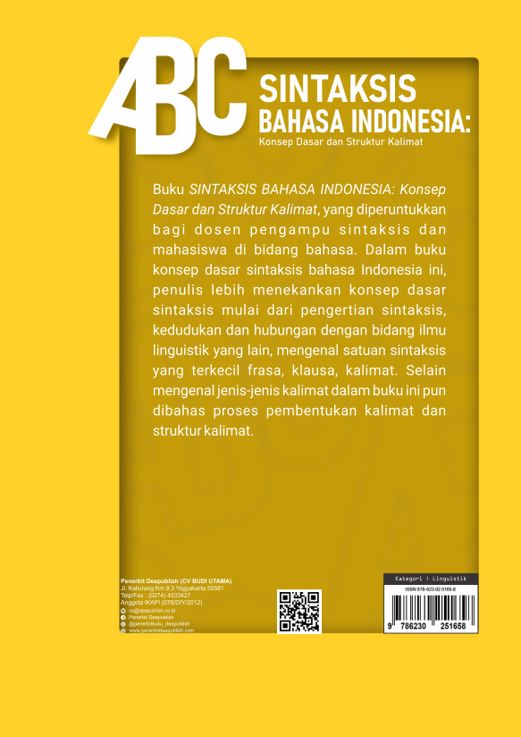 Buku Sintaksis Bahasa Indonesia: Konsep Dasar dan Struktur Kalimat ini diterbitkan oleh Penerbit Buku Pendidikan Deepublish.