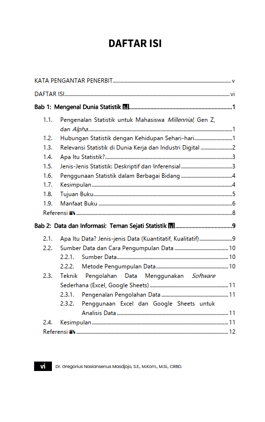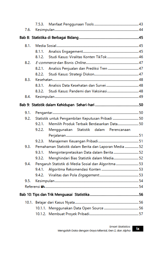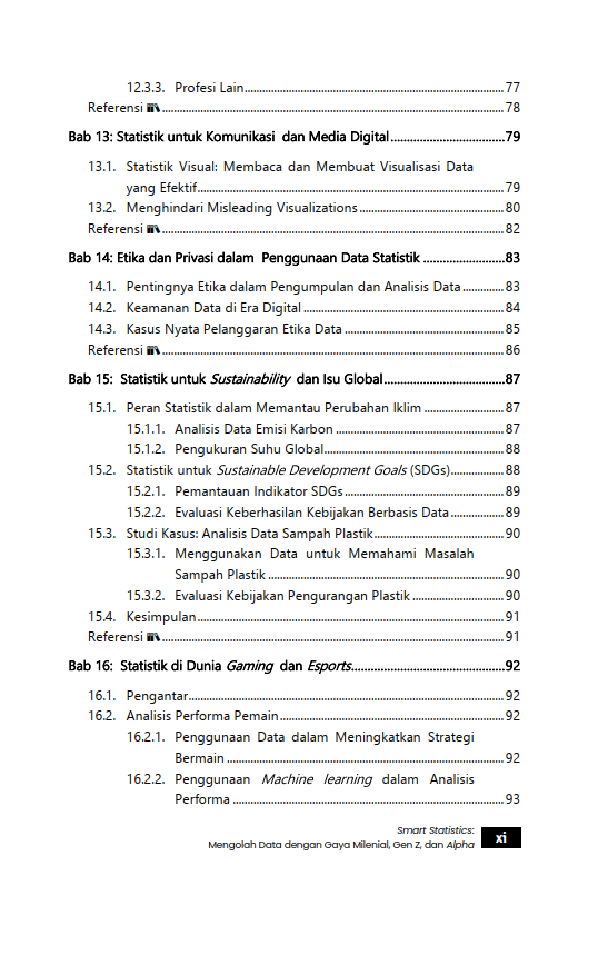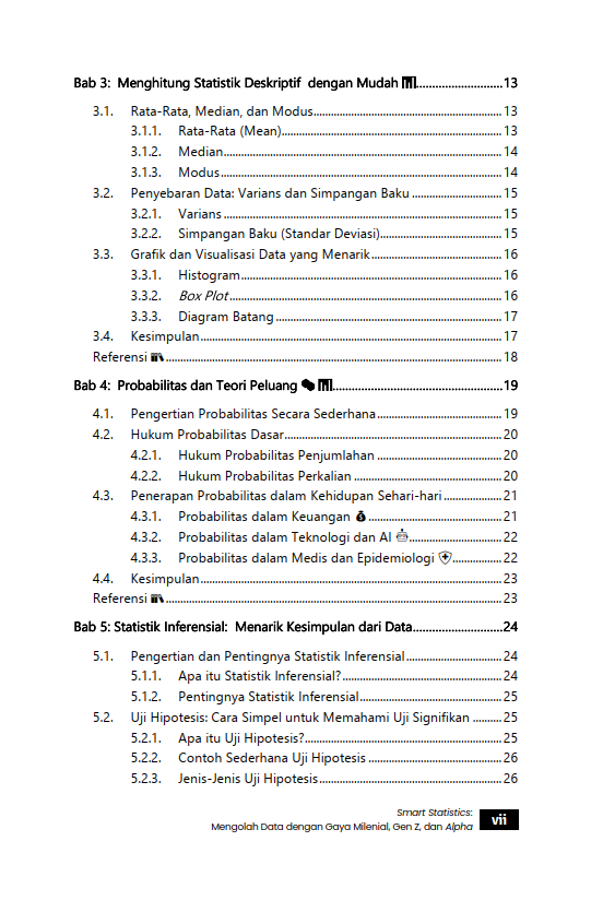 Berikut Daftar Isi Buku Statistika yang berjudul Buku Smart Statistics: Mengolah Data dengan Gaya Milenial, Gen Z, dan Alpha, diantaranya: